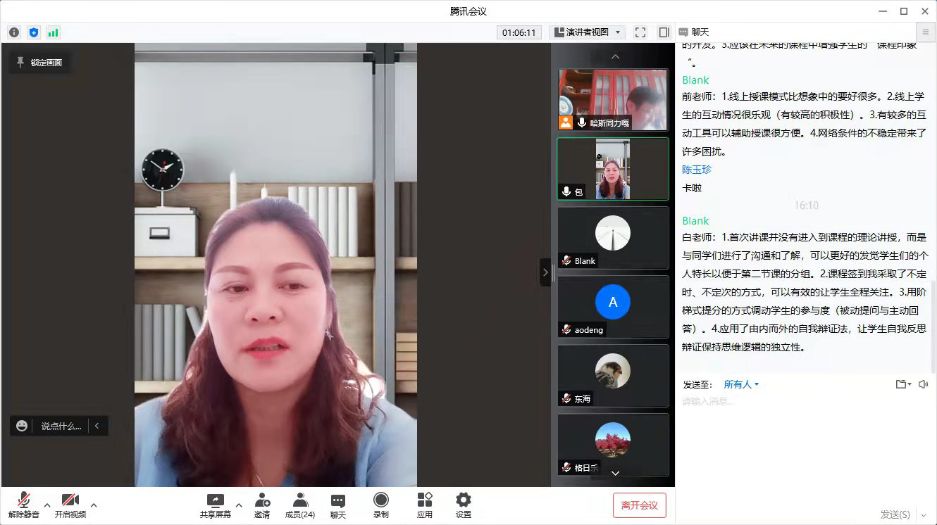 教研活動圍繞如何提高《創新創業思維與訓練》課程線上授課質量,老師們總結各自的教學情況和心得體會進行輪流發言,并就如何將《創新創業思維與訓練》的特點與線上教學結合、實踐教學環節如何有效實施、時間把控等問題,大家積極發言進行了深入探討。接著化學與環境學院副教授包秀霞博士分享了《創新創業思維與訓練》課程的第五塊內容“瘋狂被子原則”。