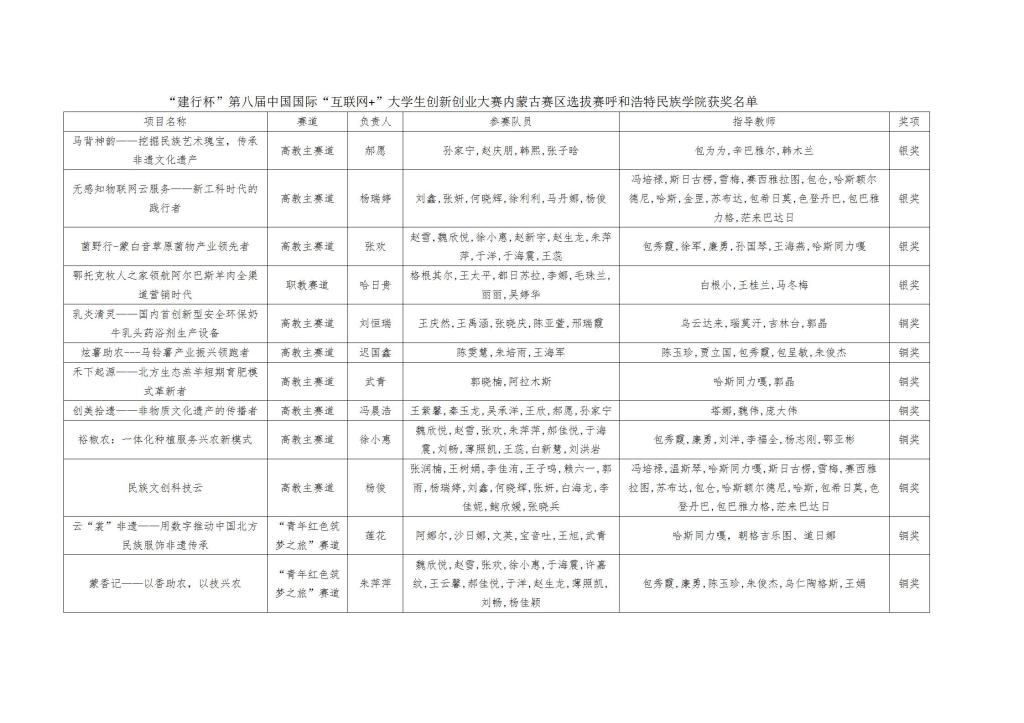 第八屆中國國際“互聯網+”大學生創新創業大賽內蒙古賽區選拔賽總決賽于8月11日下午圓滿落幕。8月15日自治區教育廳發布《關于“建行杯”第八屆中國國際“互聯網+”大學生創新創業大賽區選拔賽評審結果的公示》,我校獲得高教主賽道3銀6銅、職教賽道1銀、青年紅色筑夢之旅賽道2銅以及青年紅色筑夢之旅賽道優秀組織獎。在獎牌總數上創我校在該賽事上的歷史最好成績。
