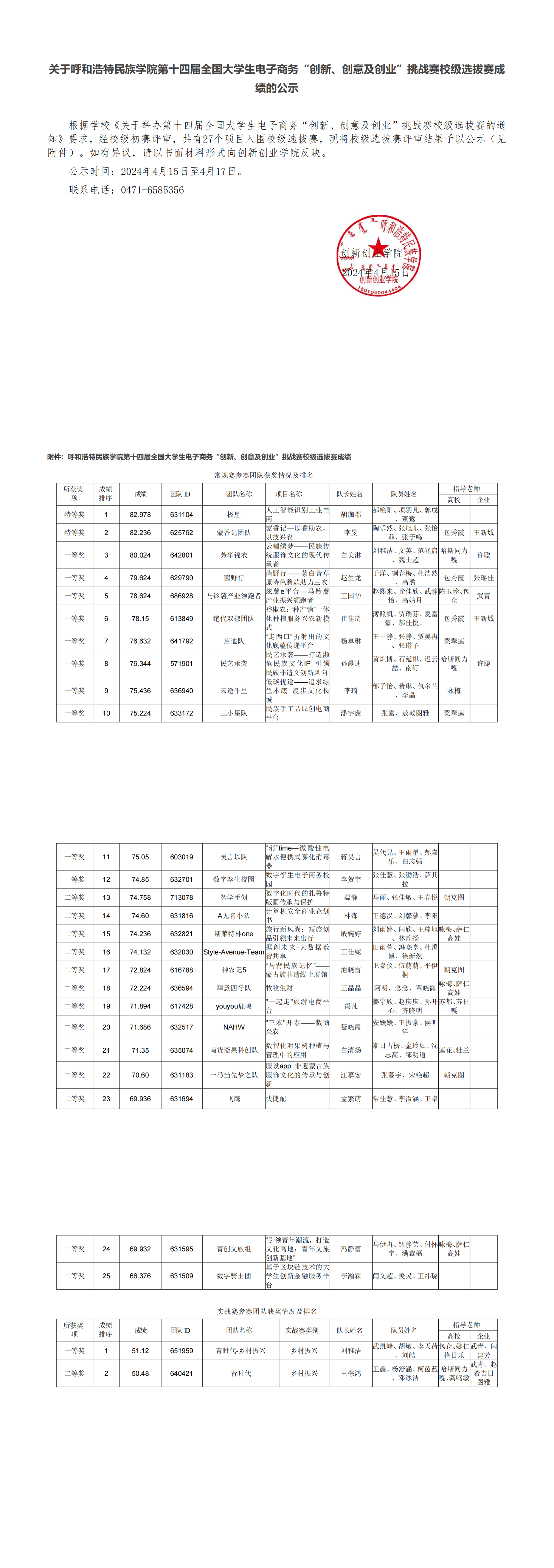 關于呼和浩特民族學院第十四屆全國大學生電子商務“創新、創意及創業”挑戰賽校級選拔賽成績的公示