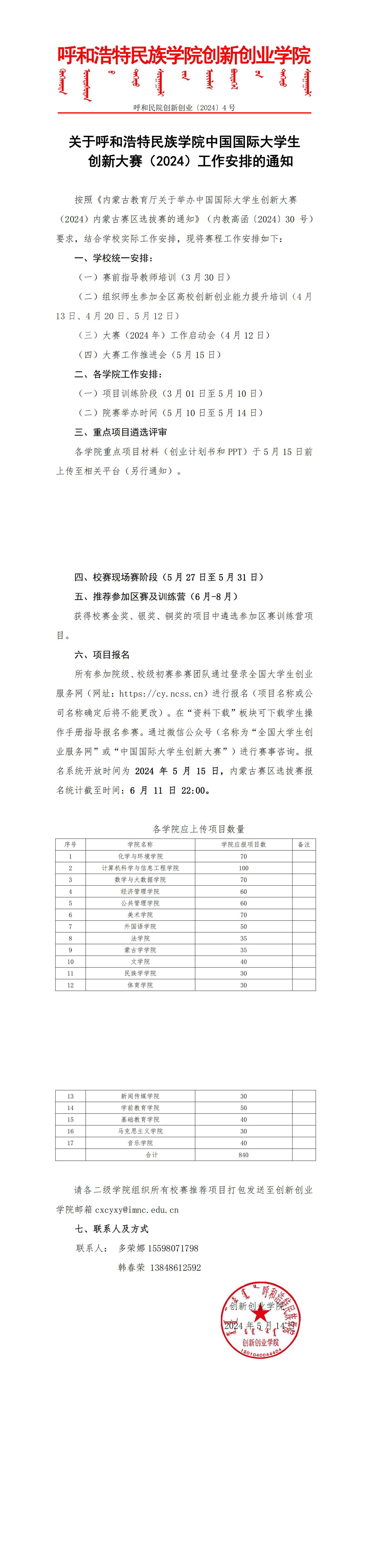 關于呼和浩特民族學院中國國際大學生創新大賽(2024)工作安排的通知