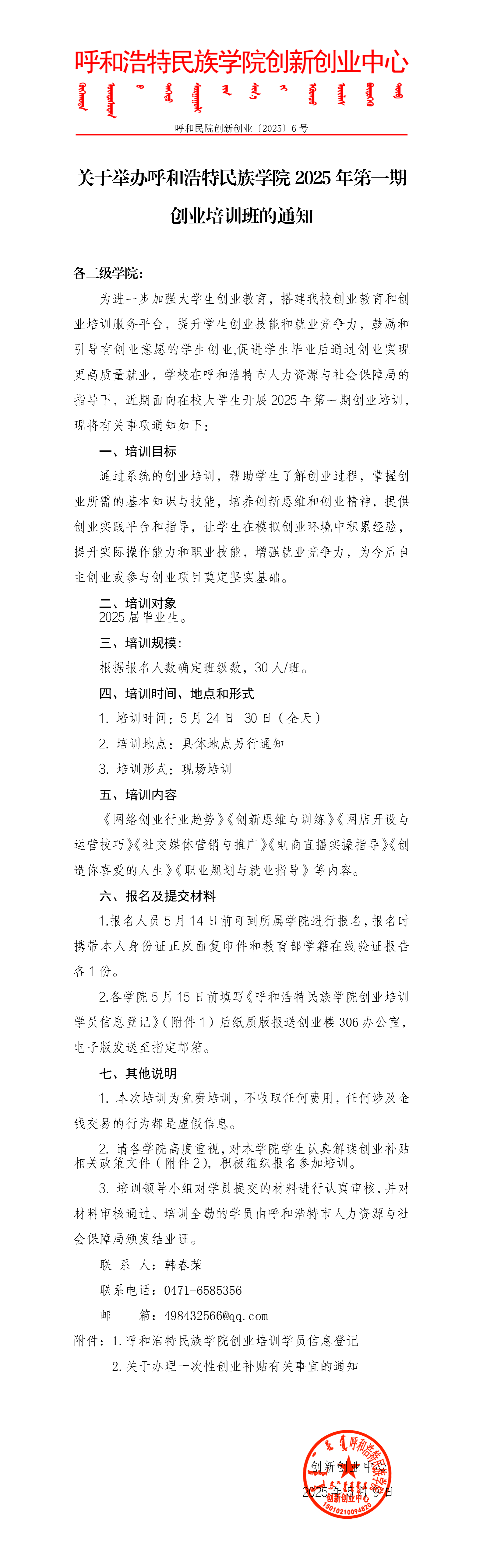 關(guān)于舉辦呼和浩特民族學(xué)院2025年第一期創(chuàng)業(yè)培訓(xùn)班的通知