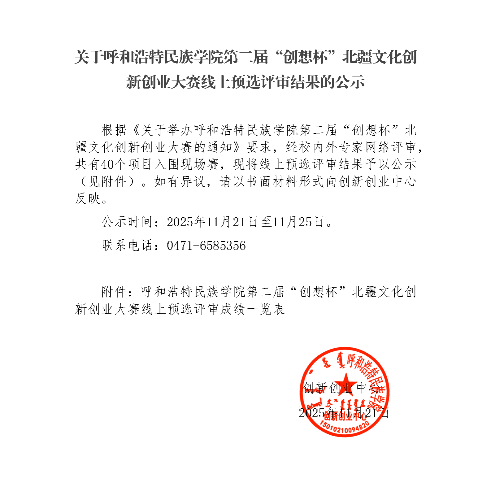 關(guān)于呼和浩特民族學(xué)院第二屆“創(chuàng)想杯”北疆文化創(chuàng)新創(chuàng)業(yè)大賽線上預(yù)選評(píng)審結(jié)果的公示