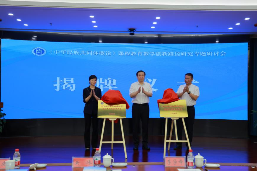 開幕式上,李學鋒、云冰、王敏共同為大中小學中華民族共同體意識教育一體化虛擬教研室、《中華民族共同體概論》課程實踐教學基地揭牌。