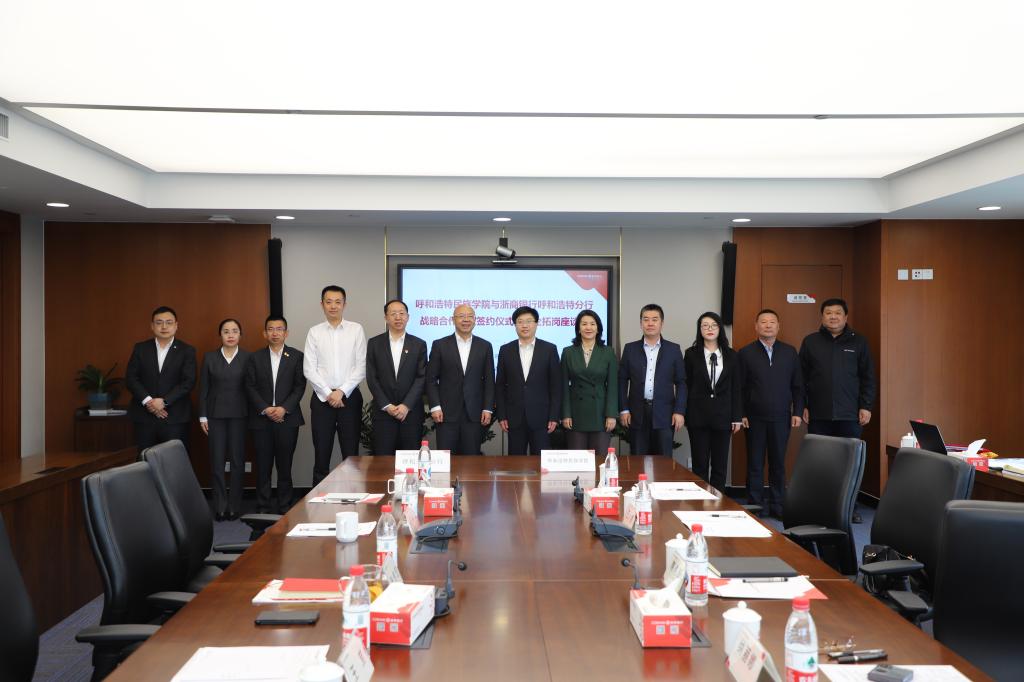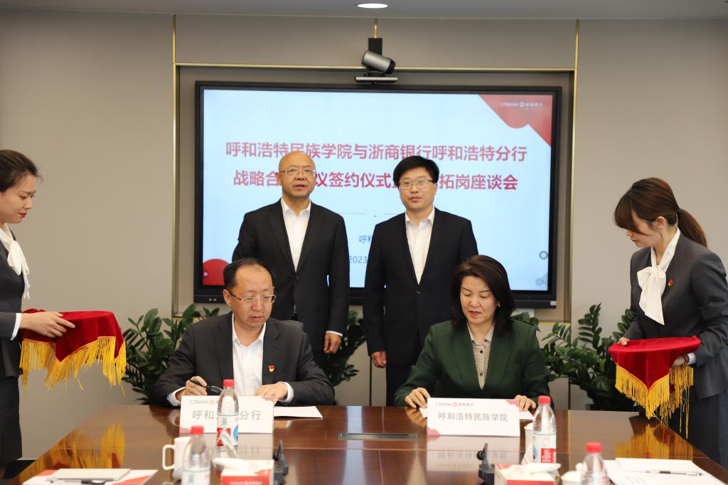 為進一步深入推動主題教育走深走實,按照主題教育目標要求,扎實推動學校事業高質量發展,5月6日下午,在浙商銀行呼和浩特分行舉行呼和浩特民族學院與浙商銀行呼和浩特分行戰略合作協議簽署儀式暨訪企拓崗座談會,并進行了參觀調研。校黨委副書記、校長韓偉新、浙商銀行呼和浩特分行黨委書記、行長張偉宏出席活動并作交流發言。副校長納麗娜與浙商銀行黨委委員王喆代表校銀雙方簽署了戰略合作協議。