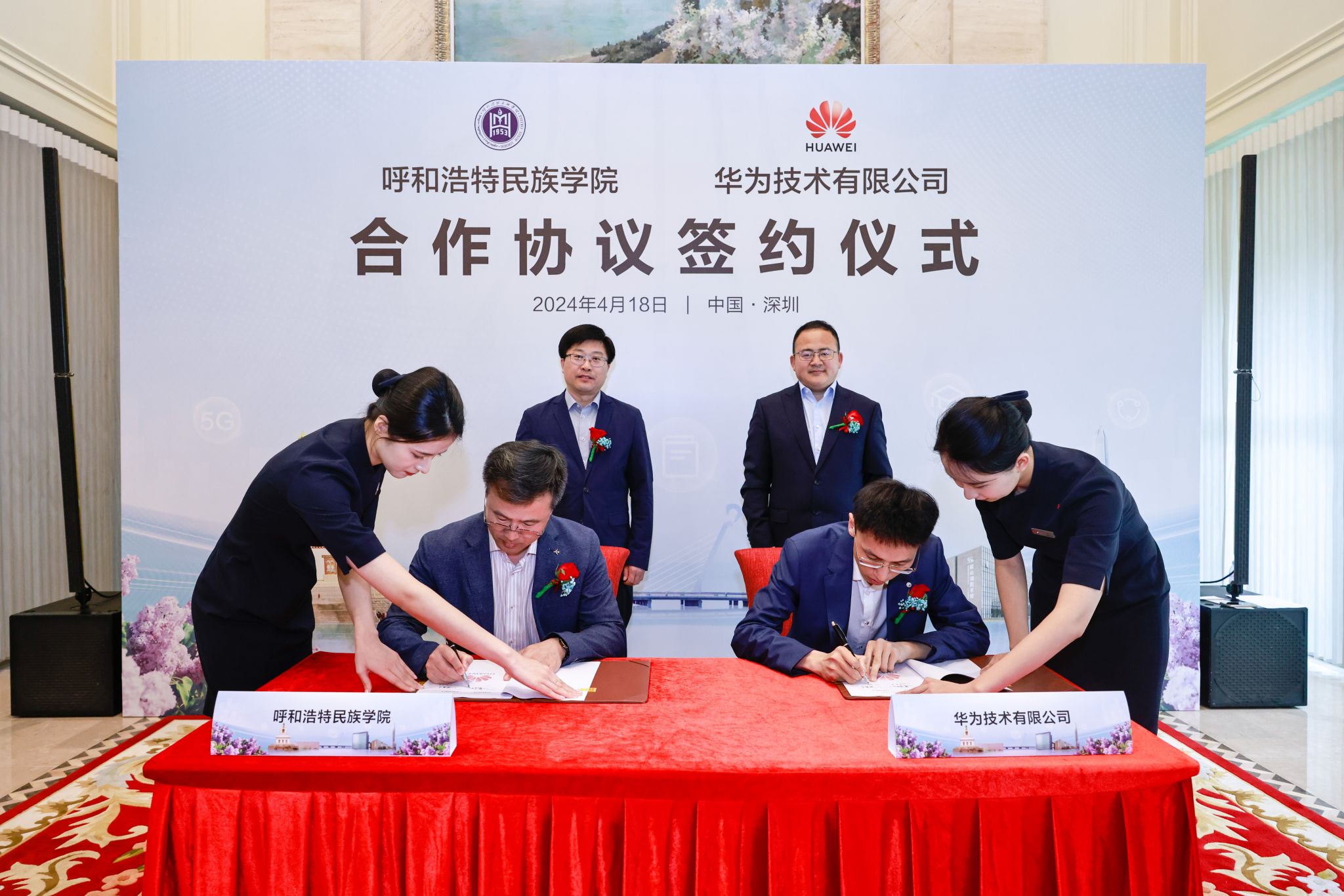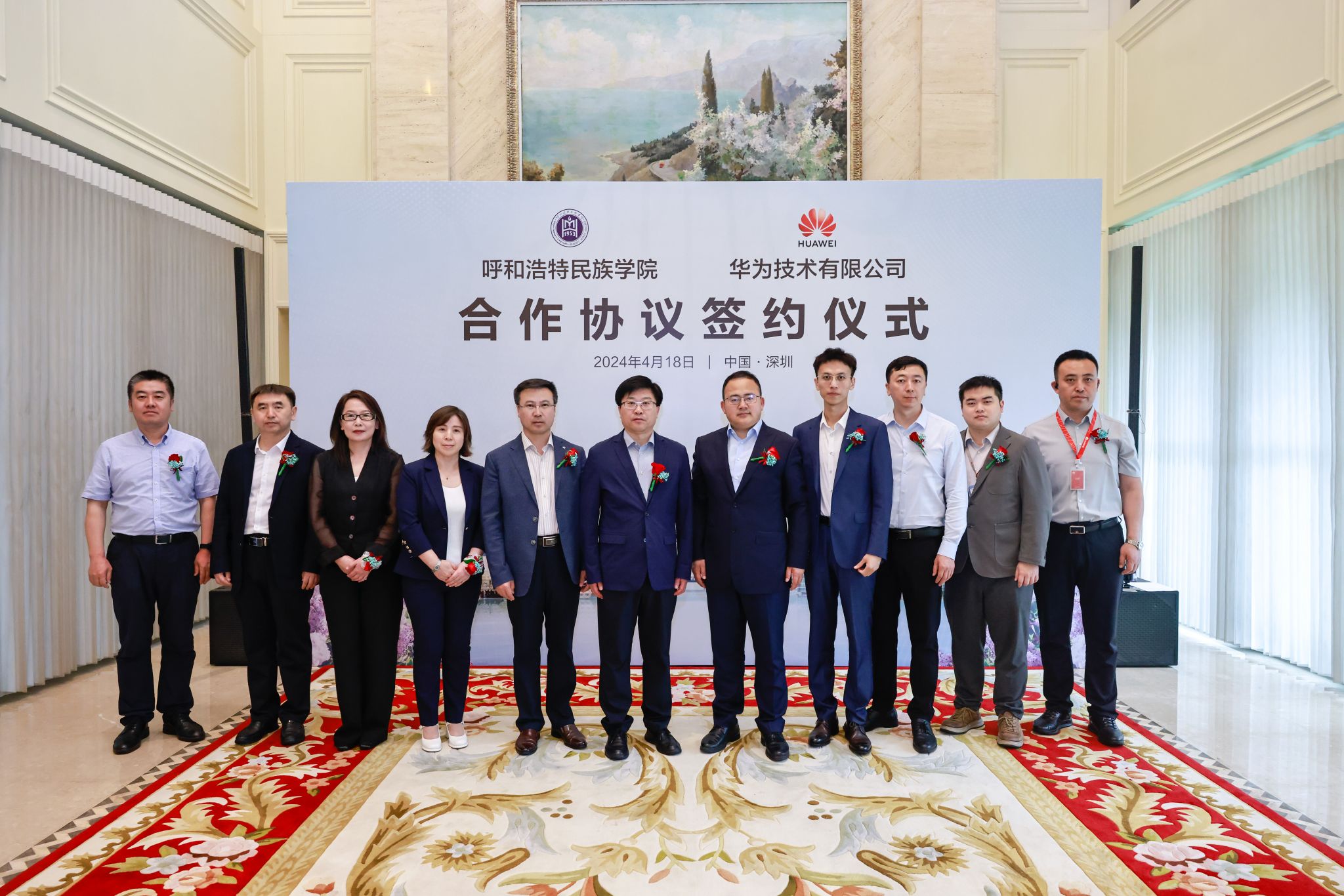 華為內蒙古政企業務總經理張玉德、學校黨委副書記、校長韓偉新出席簽約儀式并致辭,華為內蒙古政企教育行業代表郝鑫宇和我校黨委委員、副校長額爾敦布和代表校企雙方簽署合作協議,華為企業與培訓認證部全球院校業務總監黨張波出席儀式,華為公司相關負責人及學校黨政辦、教務處、計算機科學學院負責人參加簽約儀式。