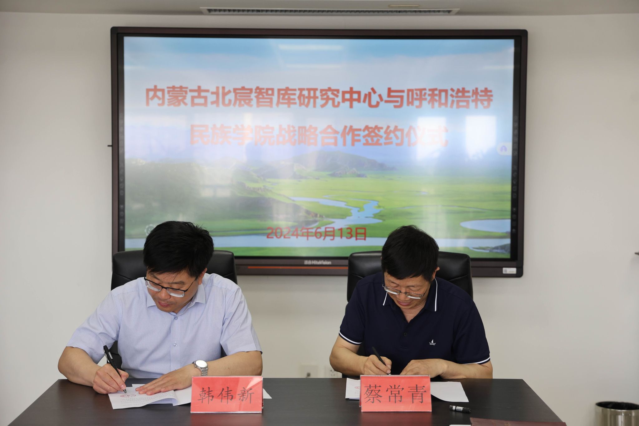 6月13日,校黨委副書記、校長韓偉新帶隊赴內蒙古北宸智庫研究中心簽署戰略合作協議,并開展座談交流。校黨委委員、副校長高喜天出席簽約儀式。內蒙古北宸智庫研究中心理事長蔡常青、北宸智庫決策咨詢專委會主任包思勤、北宸智庫民族政策專委會主任毅松、北宸智庫研究中心監事長馬益波及北宸智庫公共傳播部吳志城出席簽約儀式。