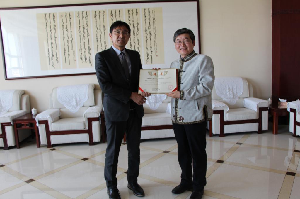 5月22日下午,我校在綜合樓10樓會(huì)議室舉行聘任儀式,聘請(qǐng)日本北海道教育大學(xué)杉山喜一教授為我校客座教授。阿拉坦倉(cāng)副校長(zhǎng)、人事處、對(duì)外合作與交流中心、體育學(xué)院負(fù)責(zé)人及相關(guān)人員參加儀式。