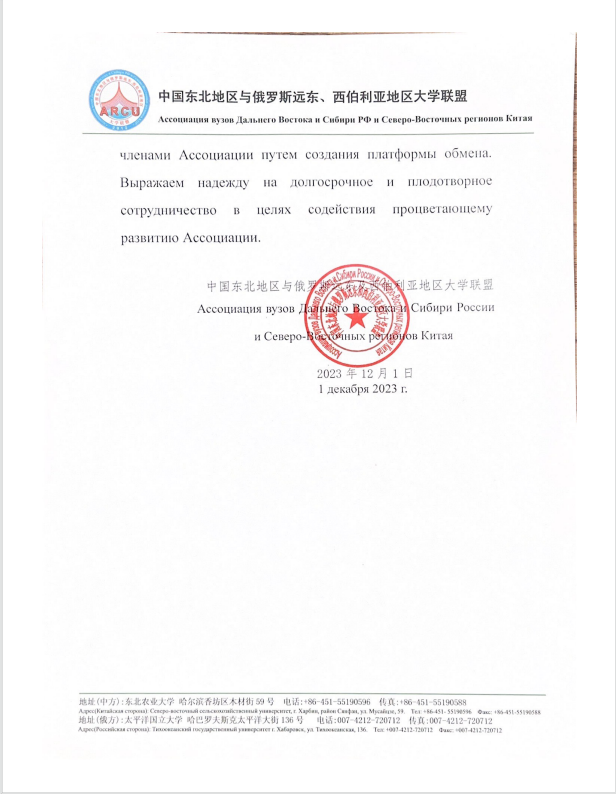 中國東北地區(qū)與俄羅斯遠東及西伯利亞地區(qū)大學聯(lián)盟于2012年9月由東北農業(yè)大學和俄羅斯太平洋國立大學發(fā)起成立。截至2023年9月,共有中方成員高校63所,俄方成員高校27所。目前由東北農業(yè)大學校長付強擔任聯(lián)盟中方主席,太平洋大學校長馬爾芬擔任聯(lián)盟俄方主席。