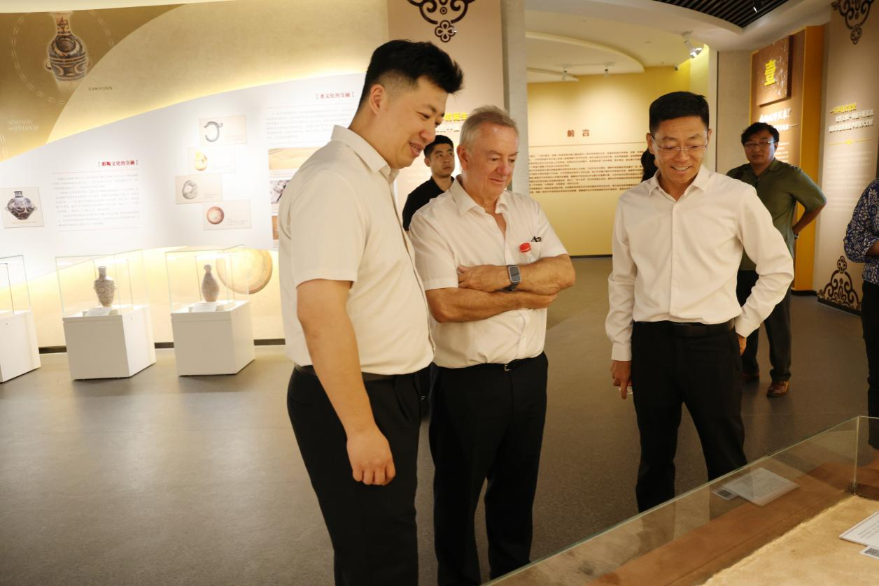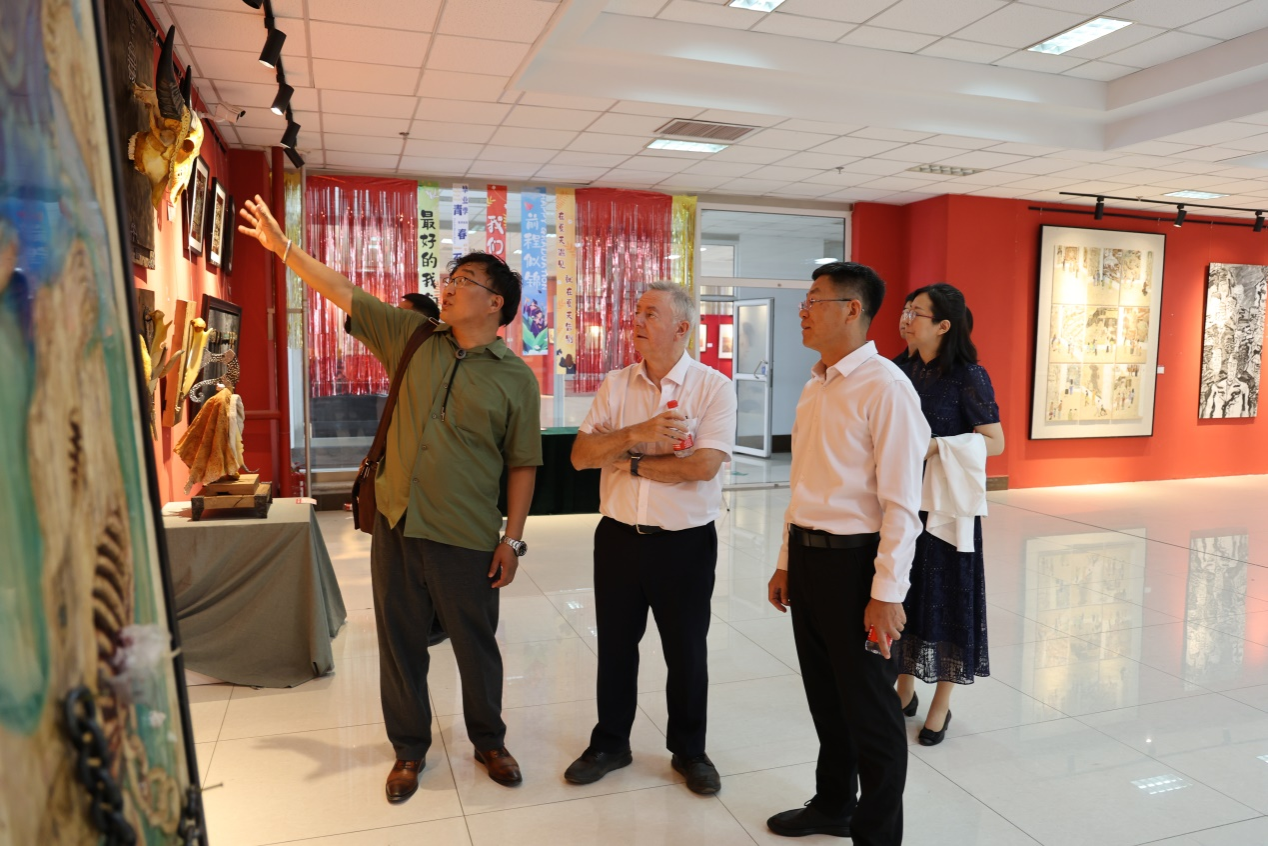 鮑勃·克萊恩一行在校領導的陪同下,參觀了校史館、鑄牢中華民族共同體意識教育館和美術學院2024屆畢業生畢業作品展等。