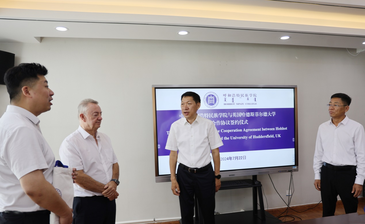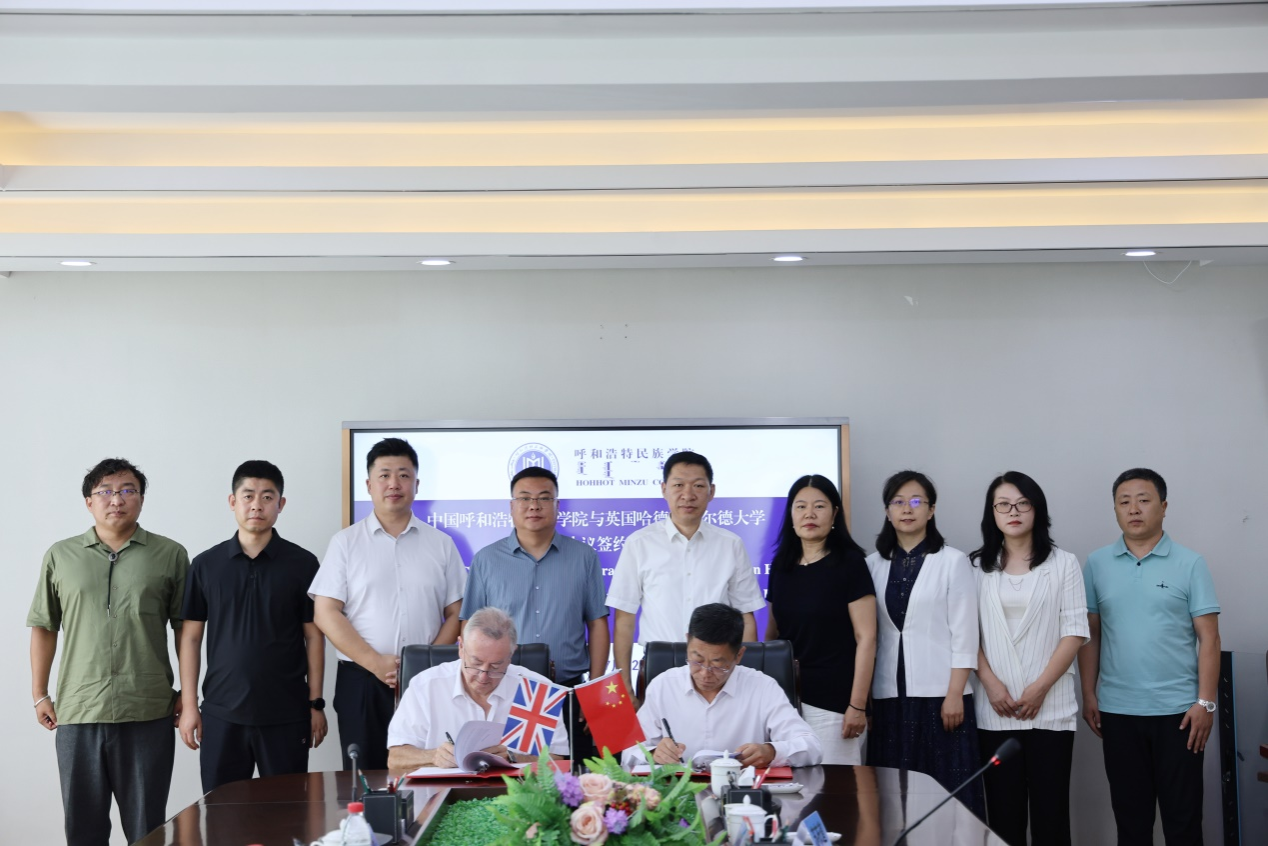 高喜天與鮑勃·克萊恩代表兩校簽署了《中國呼和浩特民族學院 英國哈德斯菲爾德大學合作諒解備忘錄》。