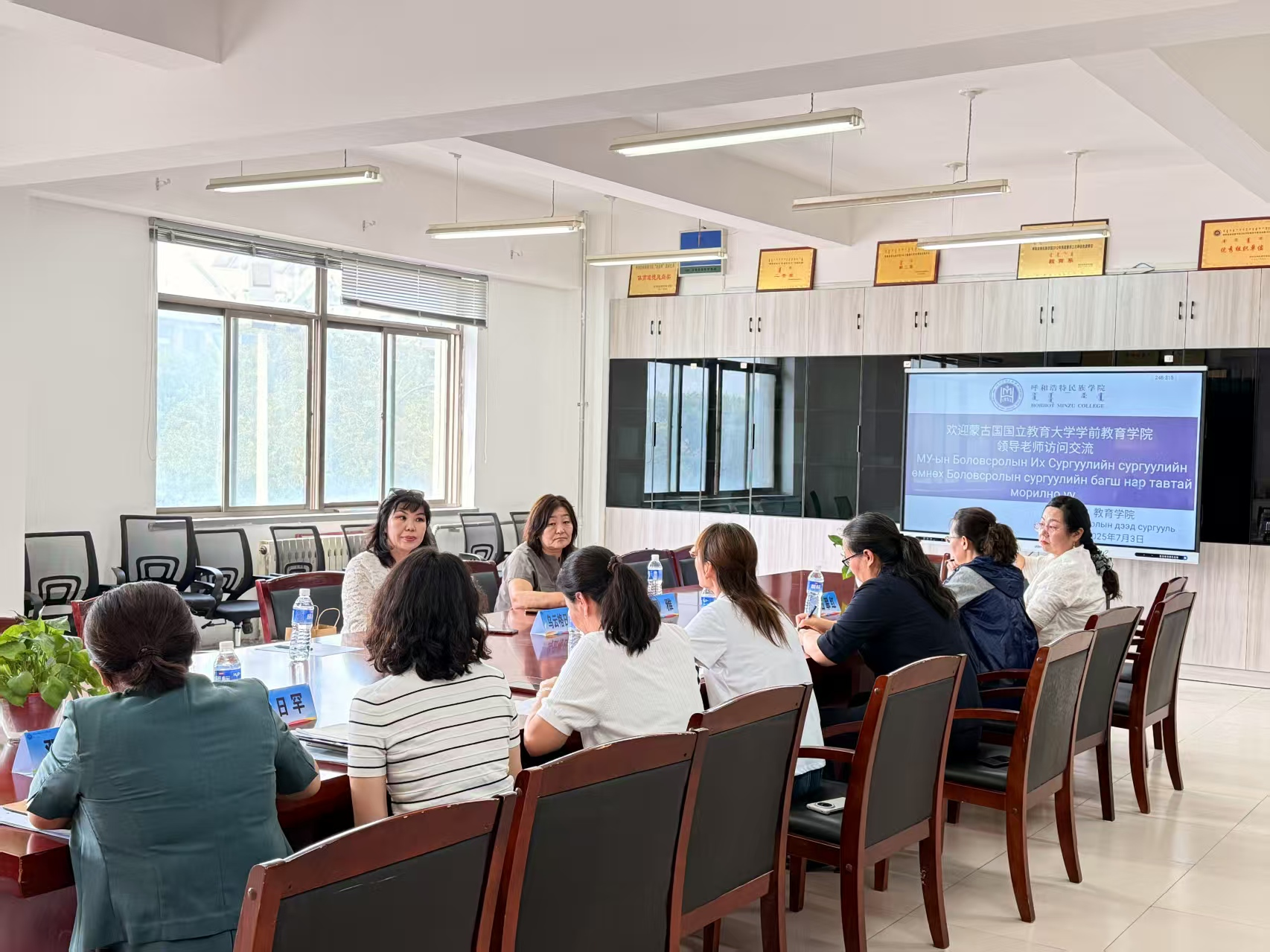 7月3日,蒙古國國立教育大學學前教育學院教務處主任圖雅博士、教師烏云格日樂博士一行蒞臨呼我校院教育學院進行訪問交流。此次訪問旨在深化兩校在學前教育領域的合作,促進師生互動與學術資源共享。學校對外合作與交流中心教師代表,教育學院領導班子成員、教研室主任、專業負責人、教師代表參加交流活動。
