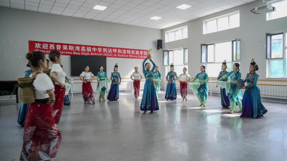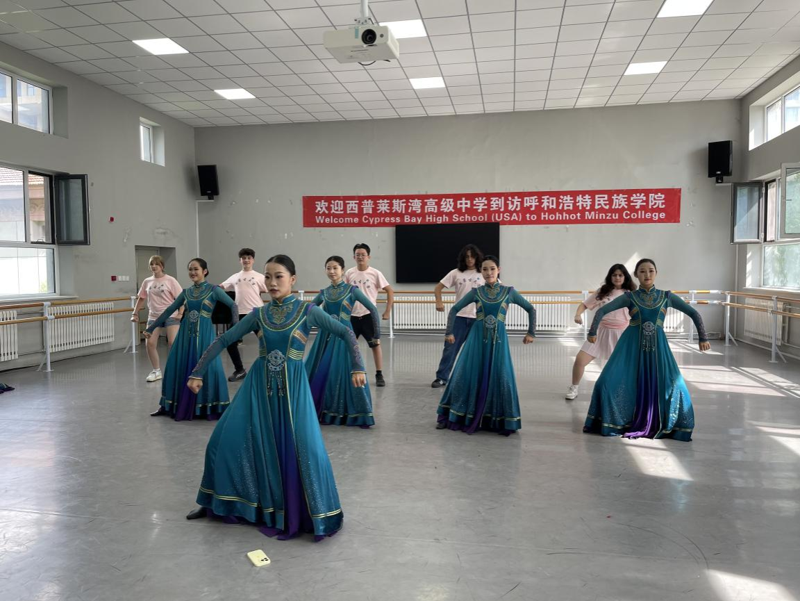 我校音樂與舞蹈學院學生為訪問團師生一行10人展示了舞蹈《茶脈共飲·絲路傳情》《萬麗》及長調民歌、馬頭琴演奏等教學實踐課程。訪問團師生與我校師生進行了互動,跟隨我校學生學習了蒙古族傳統舞蹈,參與了舞蹈實踐表演,從抖肩、擺臂的動作中觸摸到了北疆文化的節奏。