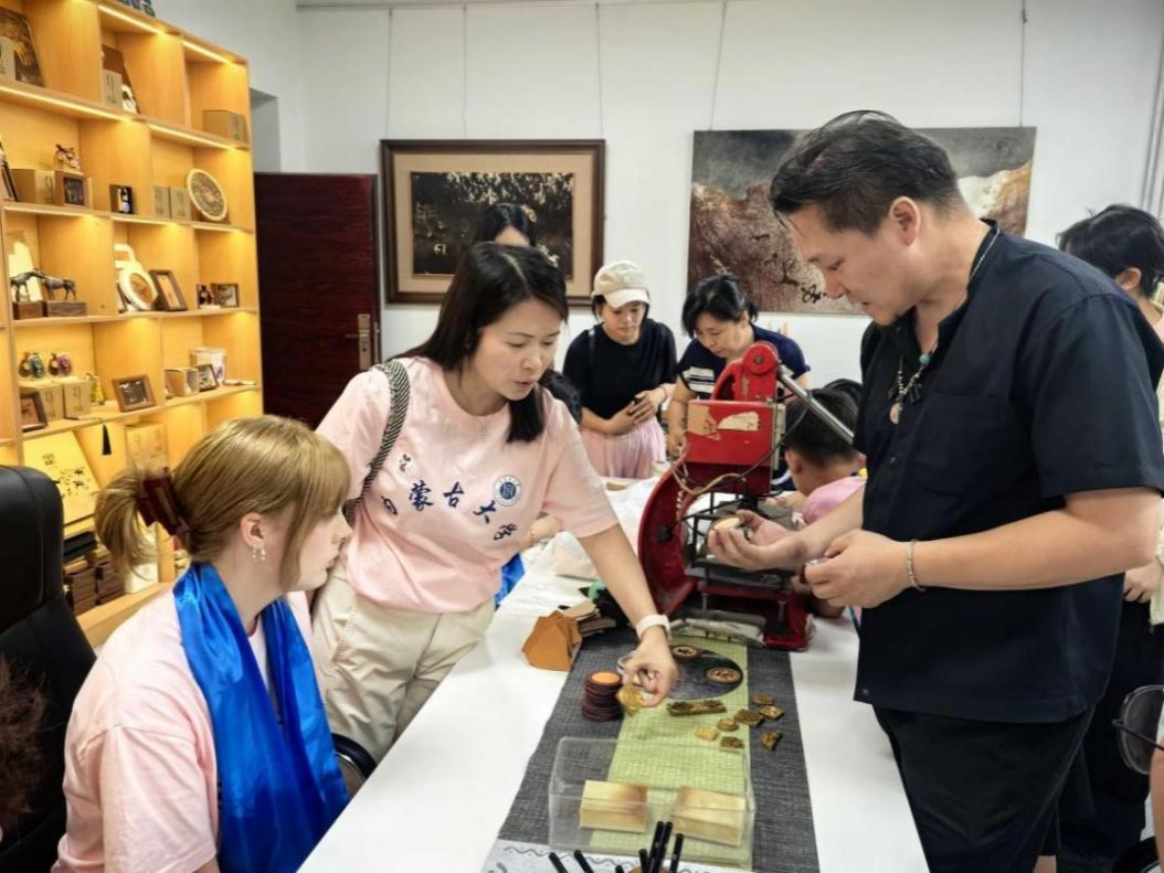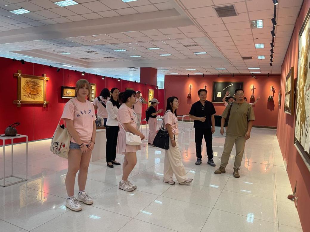 訪問團師生在美術與設計學院參觀了非遺美術作品展,走進自治區級創新工作室“木仁創新工作室”,學習體驗了皮畫、毛氈等非遺美術作品制作,感受到了北疆非遺技藝里的匠心與文化密碼,在創作互動中實現了審美與情感的跨文化共鳴。
