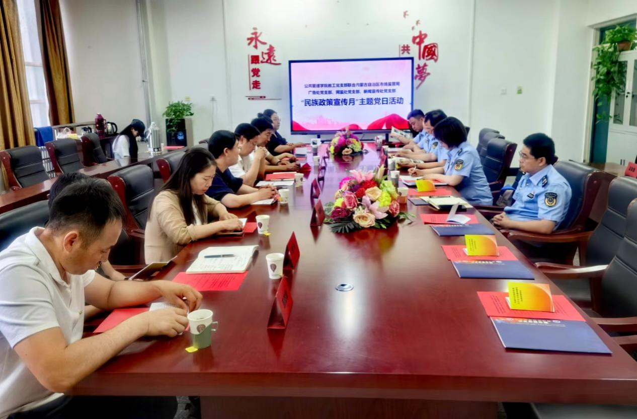 5月28日,公共管理學(xué)院教工黨支部聯(lián)合自治區(qū)市場監(jiān)管局廣告處黨支部、網(wǎng)監(jiān)處黨支部、新聞宣傳處黨支部共同組織開展了“民族政策宣傳月”主題黨日活動(dòng)。
