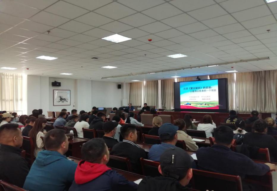 為了進一步貫徹落實習近平總書記有關民族工作的論述及指示批示精神,于2020年10月29日下午,特邀請歷史文獻研究方面的知名學者——葉爾達教授,以漢譯《蒙古秘史》的啟迪:——古籍得以傳承的一個側面為題,進行了一次鑄牢中華民族共同體意識方面的教育,我院師生共120余人聆聽該講座。
