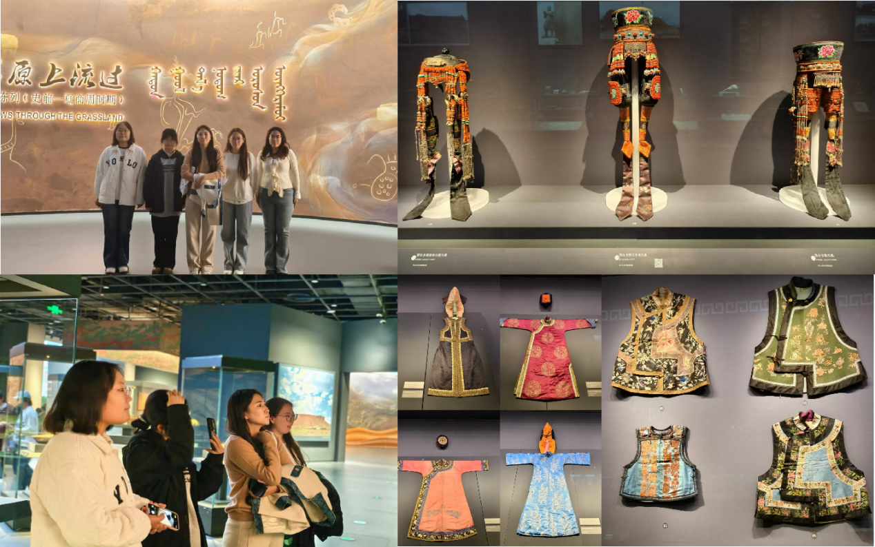 調(diào)研首站,學(xué)生們走進(jìn)了鄂爾多斯市博物館,通過(guò)豐富的藏品和生動(dòng)的展覽,深入了解了鄂爾多斯的歷史文化,為后續(xù)的調(diào)研奠定了堅(jiān)實(shí)基礎(chǔ)。隨后,團(tuán)隊(duì)深入烏審旗,實(shí)地探訪多家民族服飾店。訪談中,學(xué)生們了解到傳統(tǒng)蒙古袍的制作工藝、市場(chǎng)定位及面臨的挑戰(zhàn),發(fā)現(xiàn)服飾店為迎合年輕市場(chǎng),在保持傳統(tǒng)的同時(shí)不斷創(chuàng)新面料與設(shè)計(jì)。此番經(jīng)歷讓學(xué)生們深刻體會(huì)到民族服飾文化在傳承與創(chuàng)新中的平衡,認(rèn)識(shí)到傳統(tǒng)服飾既是民族文化的載體,也需與時(shí)俱進(jìn),融入現(xiàn)代元素,以煥發(fā)新的生命力。