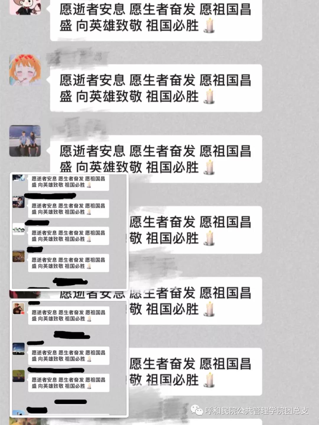 此外,學生還用微信群接力的方式紛紛在線上進行留言,向因抗擊疫情而犧牲的英烈表達自己的哀思,并祝愿祖國繁榮昌盛!!!