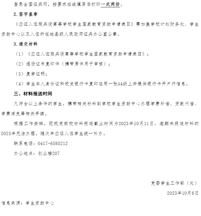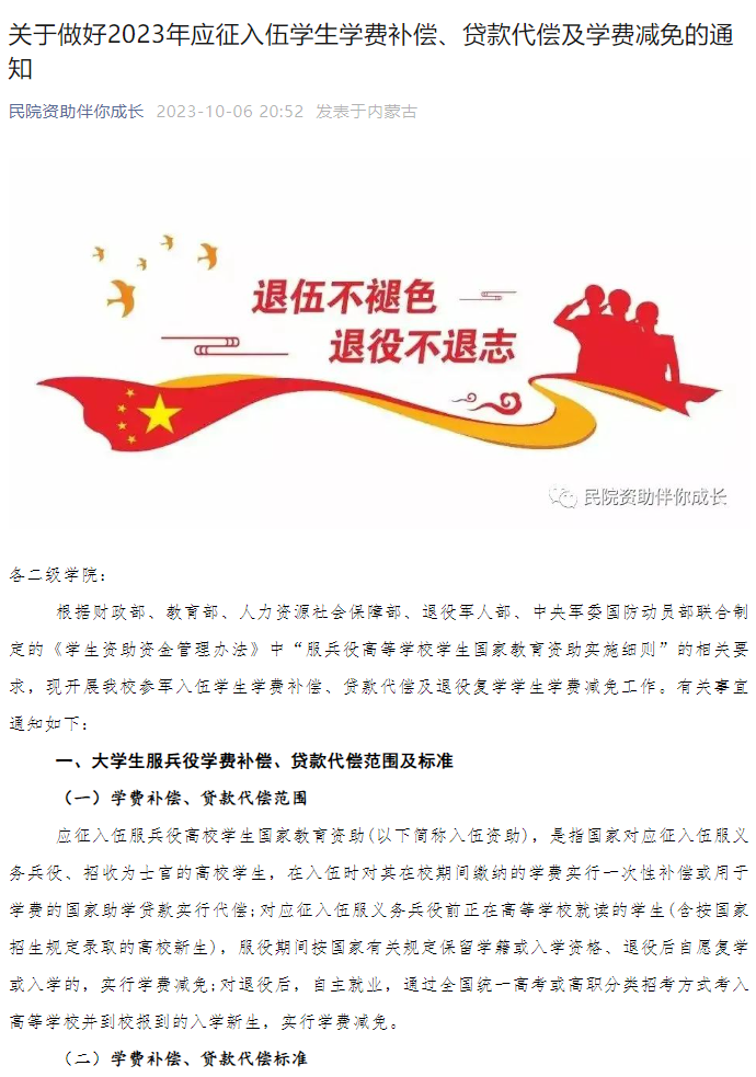 轉載學校黨委學生工作部(處)《關于做好2023年應征入伍學生學費補償、貸款代償及學費減免的通知》