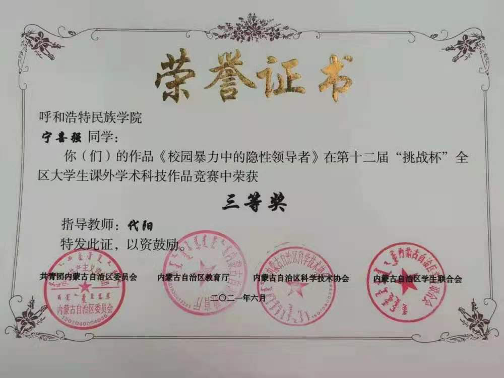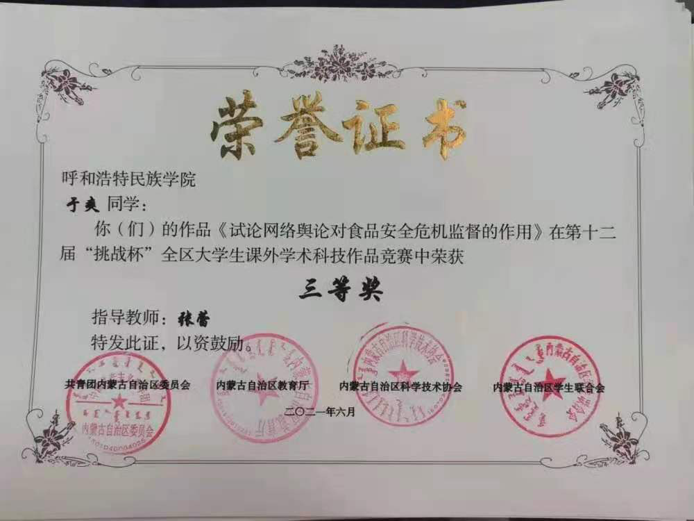 由共青團內蒙古自治區委員會、內蒙古自治區教育廳、內蒙古自治區科學技術協會和內蒙古自治區學生聯合會主辦的第十二屆“挑戰杯”全區大學生課外學術科技作品競賽中我院學生喜獲佳績。學院教工黨支部深入貫徹落實黨史學習教育部署要求,黨員教師亮出身份、履行職責,為學生們提供競賽指導,筑夢成長。在張蕾老師和代陽老師的精心指導下,我院于爽同學的參賽論文《試論網絡輿論對食品安全危機監督的作用》、馬馳俊同學的參賽論文《淺談呼和浩特民族學院學生校園生活垃圾分類存在的問題》和寧喜強同學的參賽論文《校園暴力中的隱性領導者》在本次比賽中分別榮獲“三等獎”。