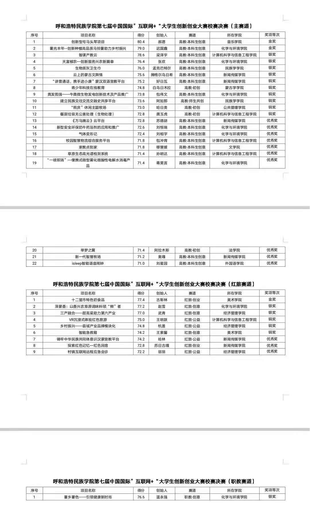 第七屆“互聯網+”大學生創新創業大賽校級決賽于2021年6月24日在圖書館二樓舉行。我院共收集到參賽策劃書56份,經過初選21個團隊進入學院初賽,阿如娜同學負責的民族地區“網絡輔助教學系統”、楠登同學負責的“牧民之友”畜牧養殖服務平臺、哈日貴同學負責的“照慶”休閑主題牧場進入校級初賽和復賽,最終哈日貴同學負責的“瑪拉沁”團隊的“照慶”休閑牧場建設項目進入校級決賽。經過5分鐘PPT項目情況介紹,1分鐘視頻展示和5分鐘回答評委提問,該項目在眾多參賽作品中脫穎而出,榮獲高校主賽道銅獎。該項目由白跟小老師和額爾敦格日樂老師指導,團隊由2020級文秘班的太平、格根其爾、薩其拉、韓丹丹等同學組成。