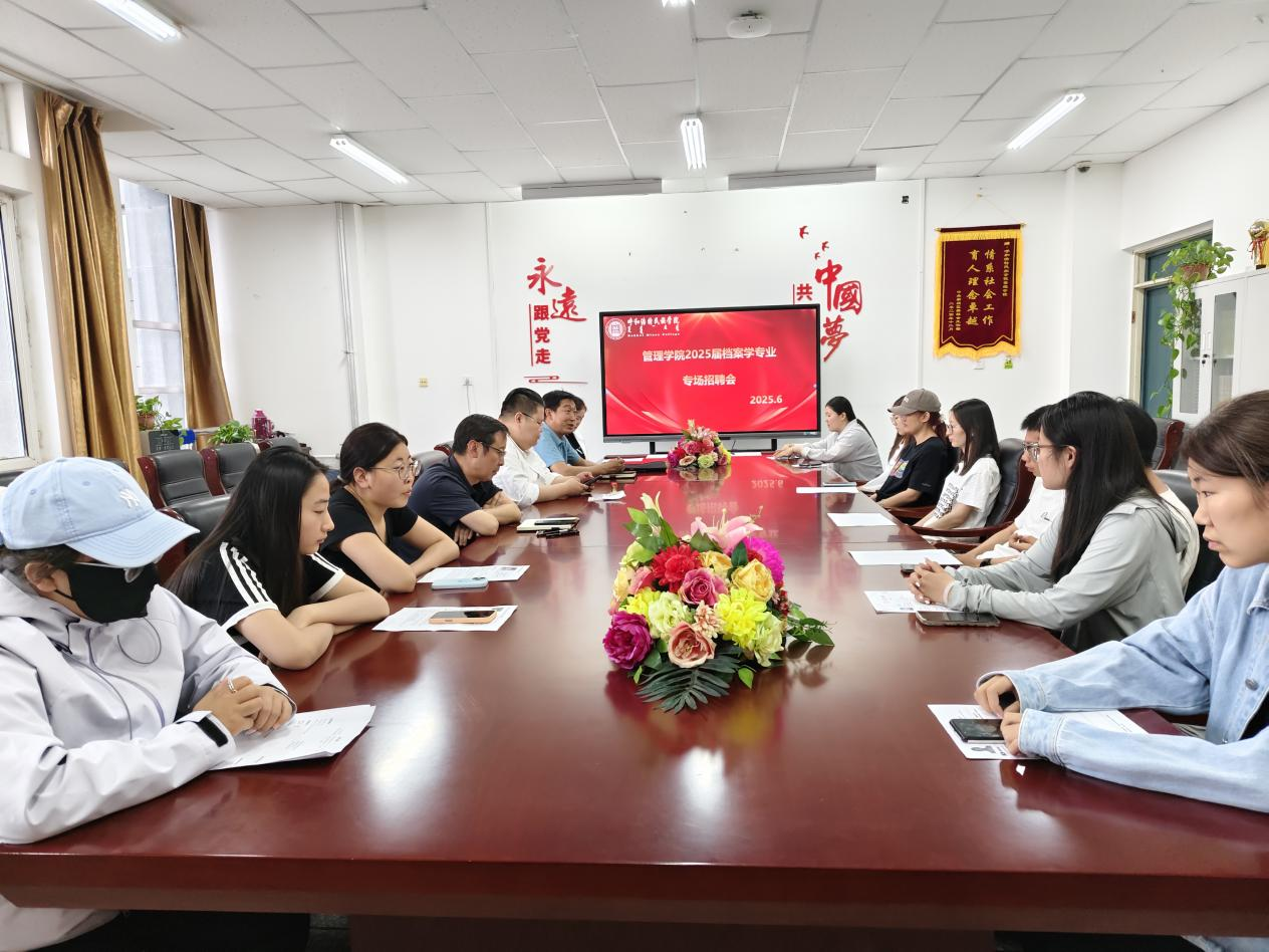 2025年5月29日,我校檔案學教研室在管理學院舉辦專場招聘會,邀請鄂爾多斯市睿元文化發展有限責任公司總經理寶上越先生來校宣講,為2025屆檔案學專業畢業生提供優質就業機會。學院院長哈斯同力嘎、黨總支副書記青格樂圖參加了活動,檔案學專業12名應屆畢業生參加招聘會。