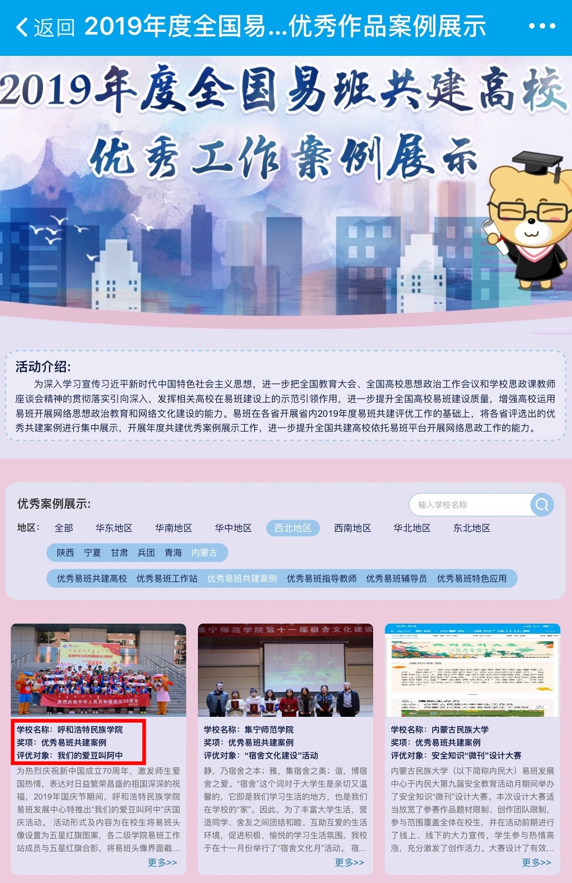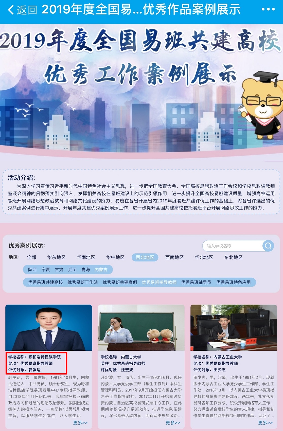 我校在2019年度內(nèi)蒙古自治區(qū)高校易班評(píng)優(yōu)活動(dòng)中,榮獲“優(yōu)秀易班共建案例”、“優(yōu)秀易班特色應(yīng)用”、“優(yōu)秀易班指導(dǎo)教師”3項(xiàng)大獎(jiǎng)。此次全國(guó)易班共建高校優(yōu)秀工作案例評(píng)選是在各省(自治區(qū))開(kāi)展省內(nèi)2019年度易班共建評(píng)優(yōu)工作的基礎(chǔ)上,將報(bào)送的優(yōu)秀共建案例進(jìn)行進(jìn)一步評(píng)選得出的結(jié)果,共展示24個(gè)省區(qū)328所高校,共9個(gè)類別的675個(gè)優(yōu)秀工作案例,