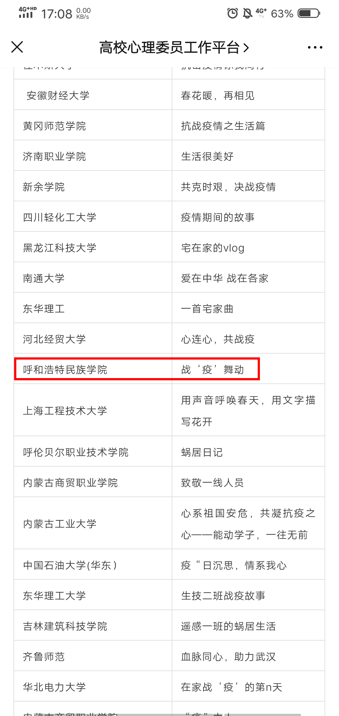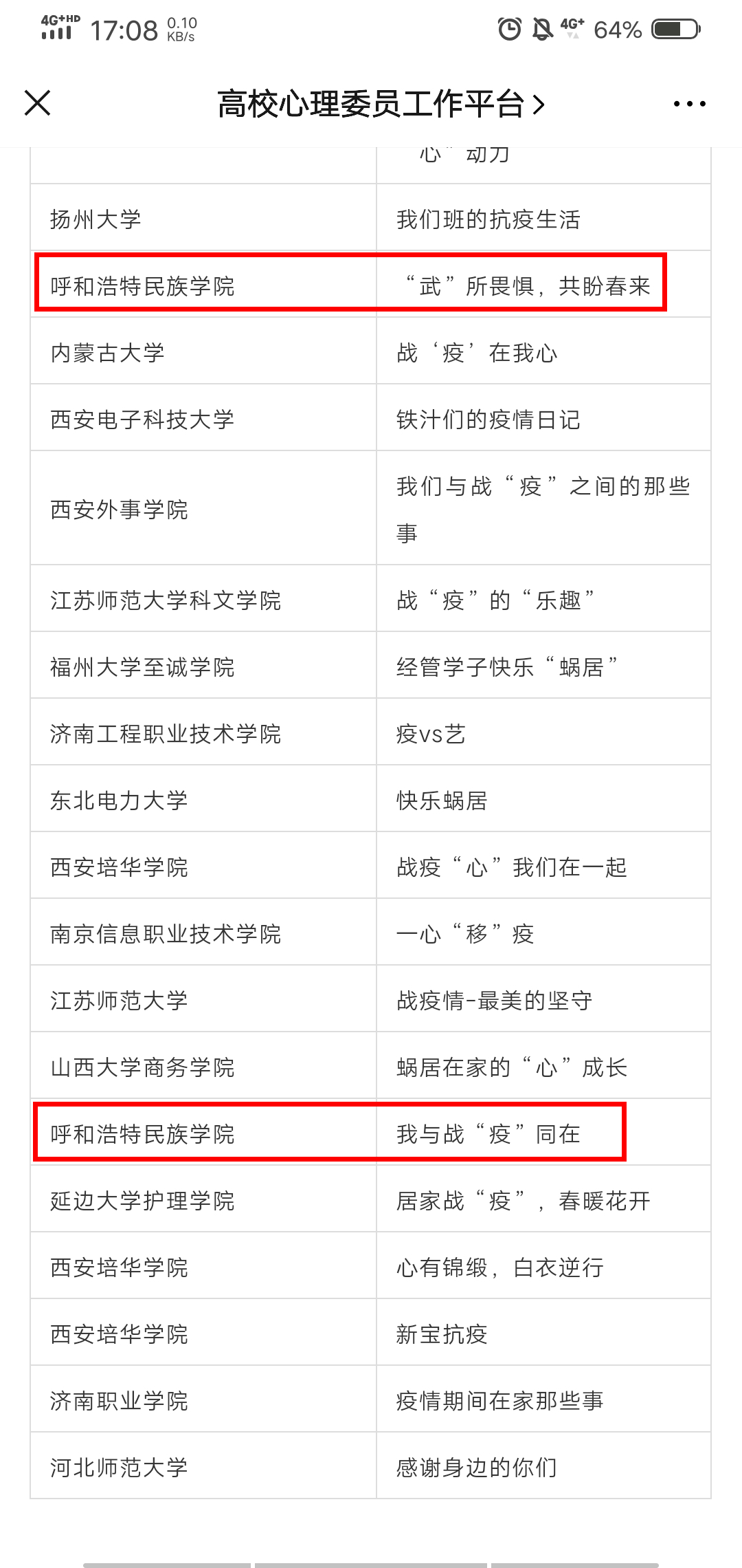 我校學生工作部積極組織各二級學院參與活動。該活動經過中國心理學會心理危機干預工作委員會專家、全國高校心理委員研究協作組理事們的精心評審。我校《戰“疫”舞動》、《“武”所畏懼,共盼春來》、《在家“抗疫”的日子》、《我與戰“疫”同在》四部作品入選優秀作品。
