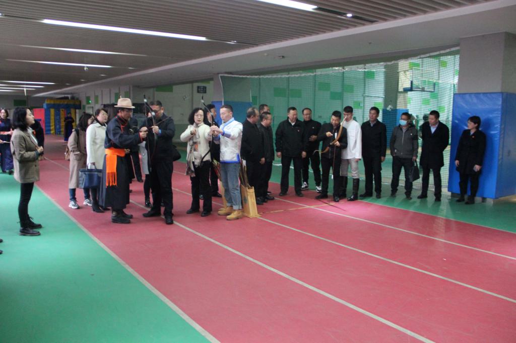 傲木格副主席一行在胡春梅副書記的陪同下一起觀看了“鑄牢中華民族共同體意識”圖片展版,美術學院民族團結進步成果展,到學校體育學院實地體驗了民族體育傳統項目布魯、射箭活動。
