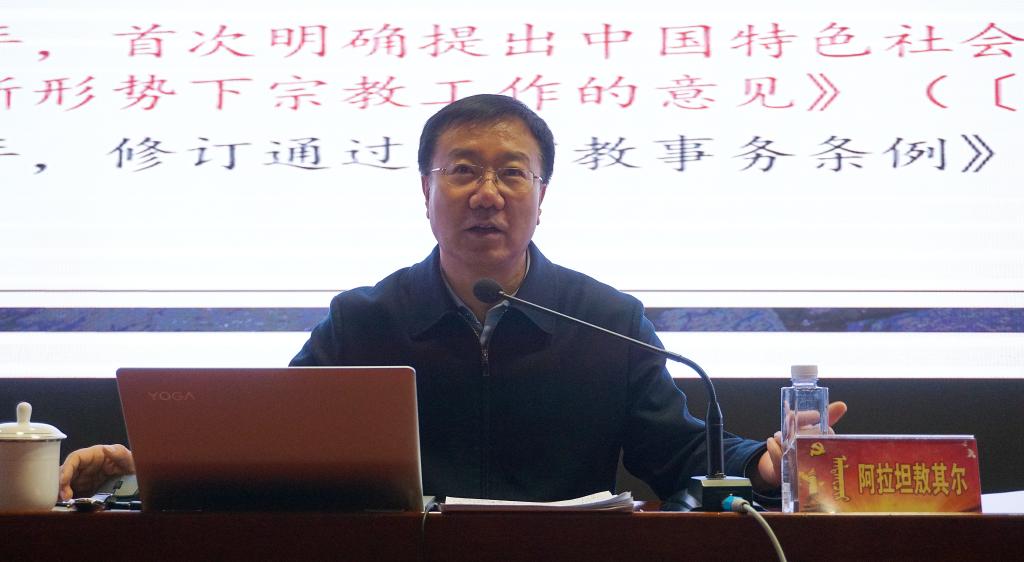 自治區(qū)統(tǒng)戰(zhàn)部副部長、宗教局局長阿拉坦敖其爾作報告