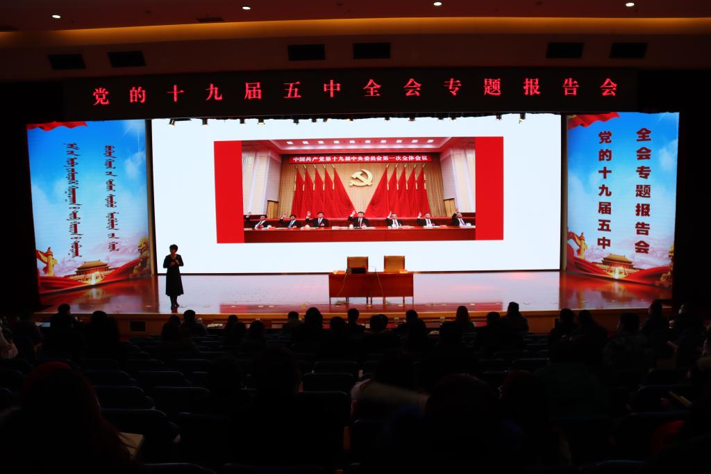 為了認(rèn)真落實高校工委《關(guān)于印發(fā)<全區(qū)教育系統(tǒng)學(xué)習(xí)宣傳貫徹黨的十九屆五中全會精神的方案>的通知》精神,按照學(xué)校黨委的安排,我校于1月9日下午,在圖書館二樓報告廳召開了黨的十九屆五中全會專題報告會暨中心組擴(kuò)大學(xué)習(xí)會。學(xué)校邀請內(nèi)蒙古師范大學(xué)黨委宣傳部部長、馬克思主義學(xué)院院長李春暉教授作了題為《擘畫新藍(lán)圖,開啟新征程》的輔導(dǎo)報告。學(xué)校黨委中心組全體成員、副處以上干部、全校黨員教職工共計320余人聆聽報告。報告會由學(xué)校黨委委員、宣傳部部長王玉玲主持。