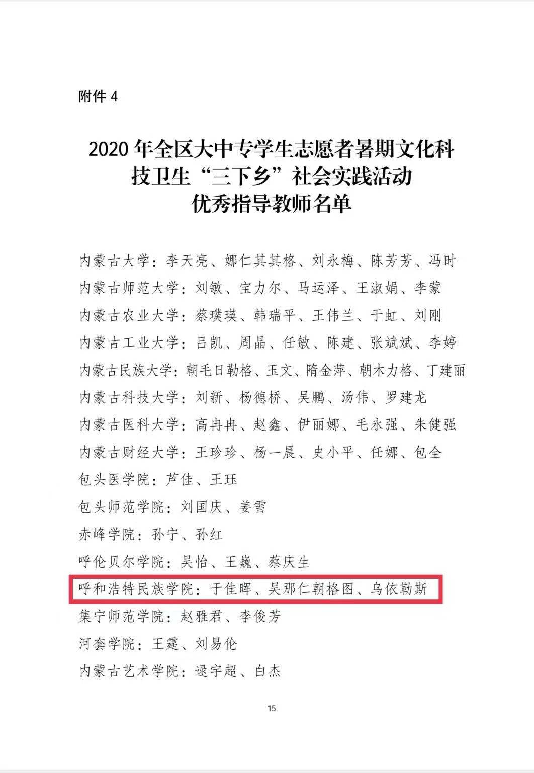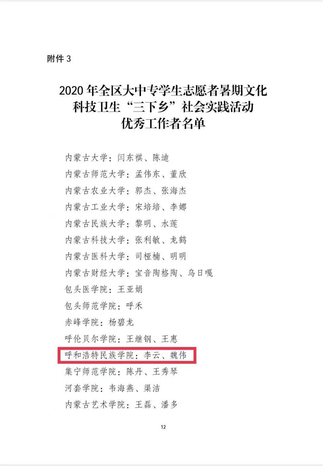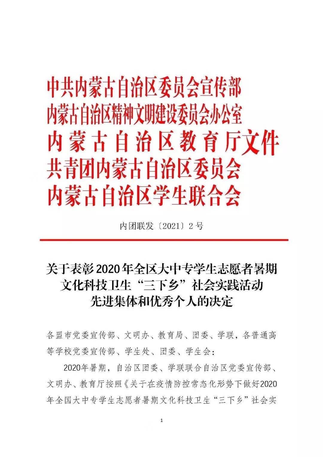 近日,自治區黨委宣傳部、文明辦、教育廳、團委、學聯聯合下發《關于表彰2020年全區大中專學生志愿者暑期文化科技衛生“三下鄉”社會實踐活動先進集體和優秀個人的決定》(內團聯發〔2021〕2 號),表彰在此項活動中表現突出的集體和個人,我校榮獲多項榮譽。