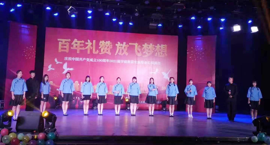 晚會(huì)在《不忘初心》的歌聲中拉開(kāi)了序幕。本次畢業(yè)匯演共有15個(gè)節(jié)目,均以“慶祝中國(guó)共產(chǎn)黨成立100周年”為主題,涉及兒童舞蹈、相聲、朗誦、合唱、歌伴舞等多種類(lèi)型,形式多樣、內(nèi)容豐富。歌舞《祝酒歌》、相聲《我的大學(xué)生活》、獨(dú)唱《愿平安》、舞蹈《What is love》、合唱《心上人》、歌曲《你的答案》等節(jié)目點(diǎn)燃了演出現(xiàn)場(chǎng)。2017級(jí)三班的詩(shī)朗誦《我的祖國(guó)》和一班的幼兒舞蹈《鄂呼蘭 德呼蘭》將整場(chǎng)晚會(huì)推向高潮。