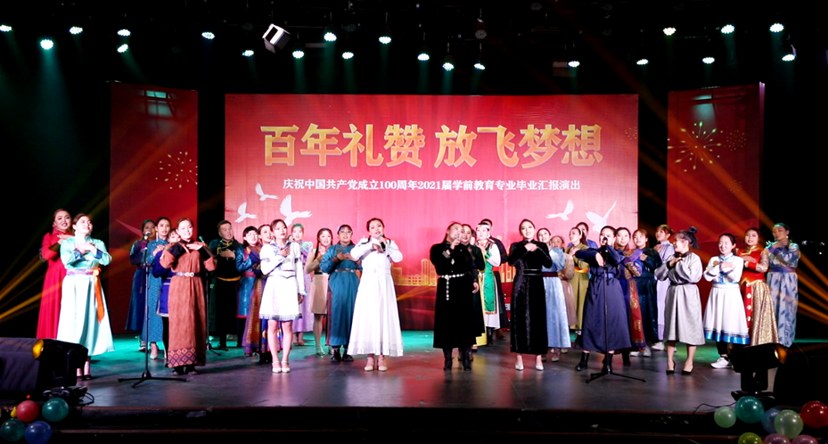 為慶祝中國(guó)共產(chǎn)黨成立100周年,學(xué)前教育學(xué)院于5月27日晚在學(xué)校演播廳舉辦“百年禮贊 放飛夢(mèng)想”2021屆畢業(yè)生匯報(bào)晚會(huì)。學(xué)校韓偉新副校長(zhǎng)、高喜天副校長(zhǎng)、部分部門(mén)負(fù)責(zé)人、呼和浩特市蒙古族幼兒園(南園)園長(zhǎng)烏日勒格、新城區(qū)第一幼兒園園長(zhǎng)計(jì)爽、新城區(qū)第二幼兒園園長(zhǎng)王煜彤、吾樂(lè)貴育兒園園長(zhǎng)烏尼爾其其格、呼和浩特市政府機(jī)關(guān)幼兒園教研組組長(zhǎng)王曉琴、新城區(qū)第十五幼兒園副園長(zhǎng)呼日雅拉圖及部分幼兒園骨干教師代表、學(xué)前教育學(xué)院歷屆優(yōu)秀畢業(yè)生代表出席晚會(huì),學(xué)前教育學(xué)院全體教師、學(xué)生代表觀看晚會(huì)。此次匯演中,學(xué)前教育學(xué)院的學(xué)子充分展現(xiàn)專(zhuān)業(yè)素養(yǎng),匯報(bào)了專(zhuān)業(yè)學(xué)習(xí)成果,并對(duì)學(xué)校和老師的培養(yǎng)表達(dá)了深深的感謝。