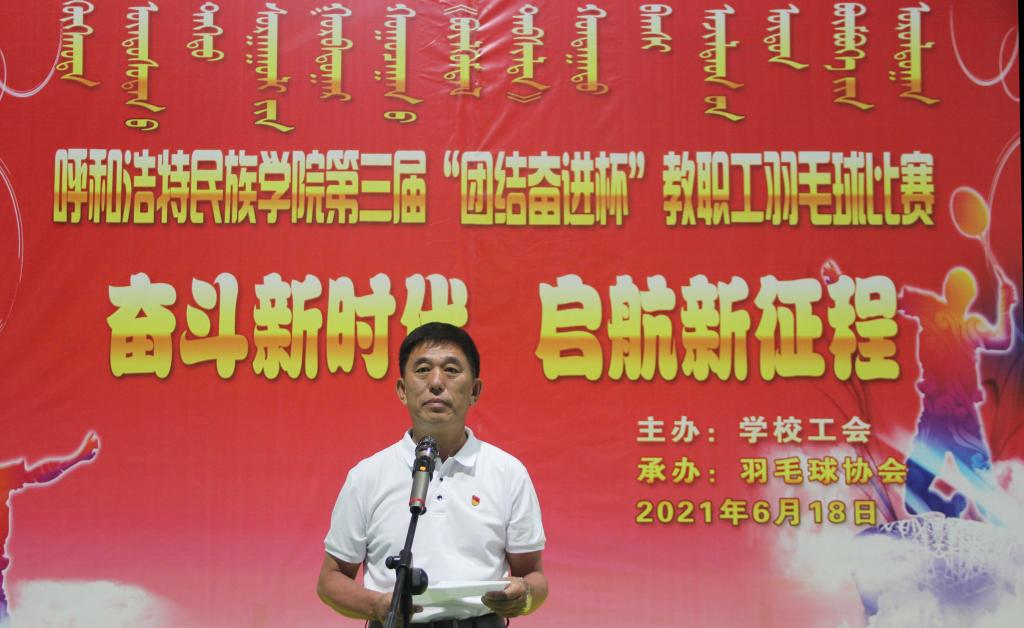 為慶祝建黨100周年,豐富教職工業(yè)余文化生活,培養(yǎng)教職工團(tuán)結(jié)、協(xié)作的團(tuán)隊(duì)意識(shí),增強(qiáng)教職工之間的溝通交流,6月18日下午,由學(xué)校工會(huì)主辦,羽毛球協(xié)會(huì)承辦的呼和浩特民族學(xué)院“奮斗新時(shí)代 出發(fā)新征程”第三屆“團(tuán)結(jié)奮進(jìn)杯”教職工羽毛球比賽,在體育館一樓舉行。學(xué)校黨委副書記、校長(zhǎng)格日樂(lè)圖,副書記胡春梅,黨委委員、副校長(zhǎng)韓偉新,黨委委員、紀(jì)委書記王冬梅,黨委委員、副校長(zhǎng)高喜天,黨委委員、黨政辦主任朝格吉樂(lè)圖及學(xué)校工會(huì)全體人員、羽毛球協(xié)會(huì)工作人員、各分工會(huì)主席、委員、全體運(yùn)動(dòng)員、裁判員160余人參加了開(kāi)幕式。開(kāi)幕式由學(xué)校工會(huì)主席邢文岐主持。