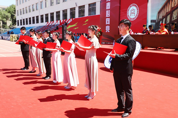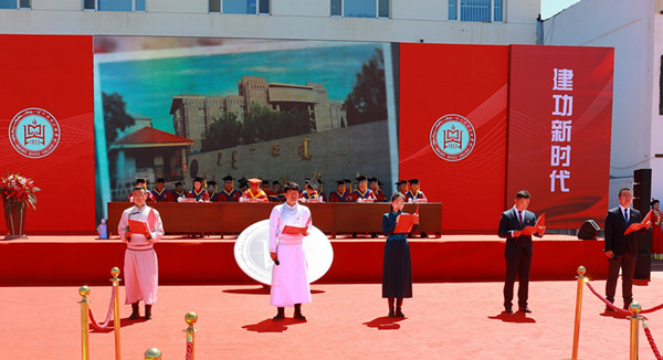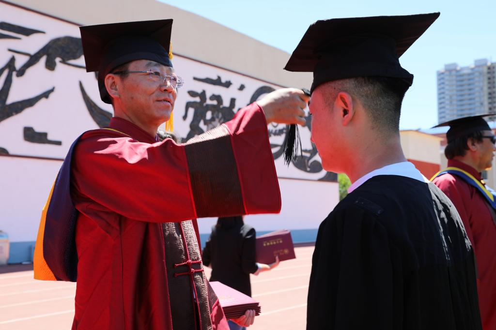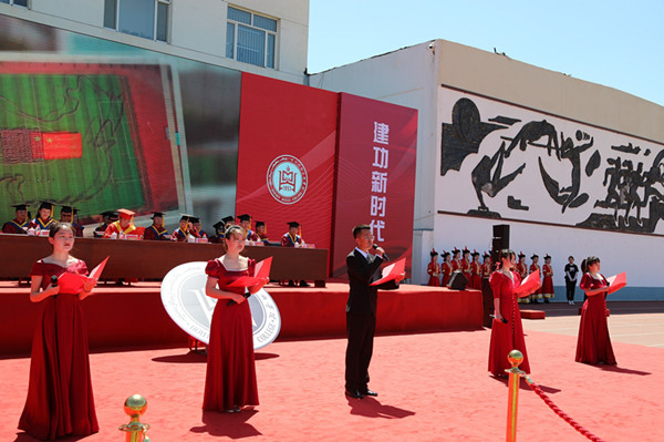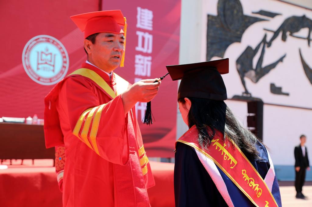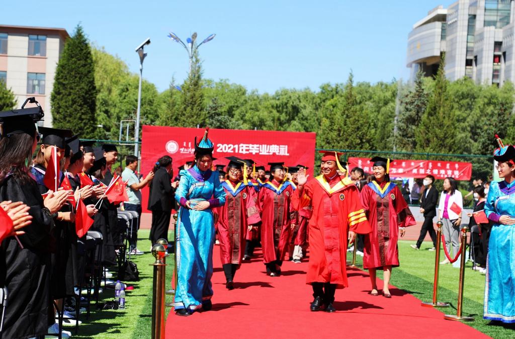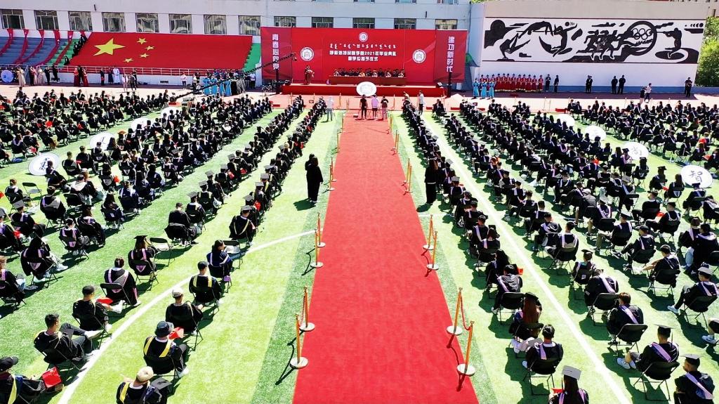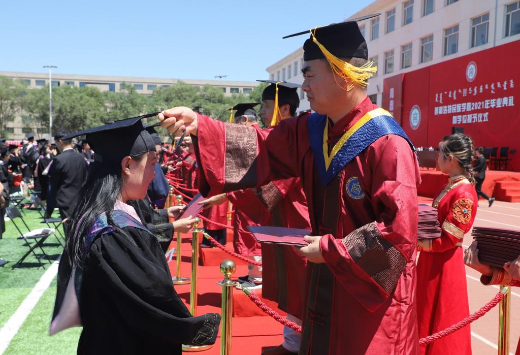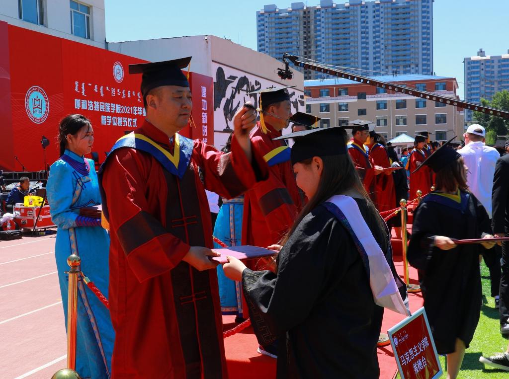 6月18日上午,我校2021屆學生畢業典禮暨學位授予儀式在南院操場隆重舉行。學校黨委副書記、校長格日樂圖,黨委副書記胡春梅,副校長納麗娜,黨委委員、副校長韓偉新,黨委委員、紀委書記、監察專員王冬梅,黨委委員、副校長高喜天出席儀式。學校學位評定委員會成員、各職能部門負責人、二級學院黨總支書記、團總支書記、學工辦主任以及畢業班班主任、輔導員、教師代表、畢業生代表等1100多人參加了儀式。學校副校長納麗娜主持儀式。