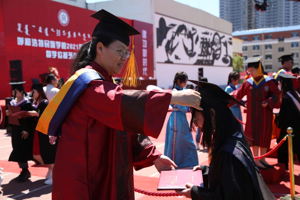 畢業典禮上,教務處副處長哈斯額爾德尼宣讀了學校本專科生畢業及學士學位授予情況。韓偉新副校長宣讀了《關于表彰2021屆優秀畢業生的決定》。校領導為優秀畢業生頒獎。