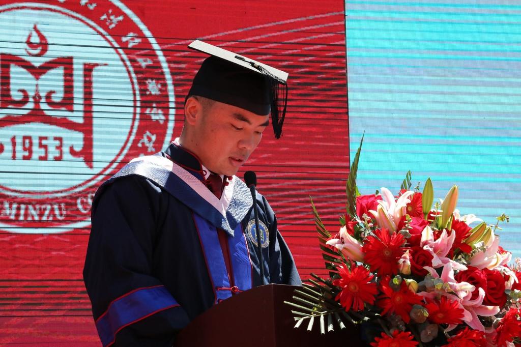 黨委副書記、校長、校學位評定委員會主任格日樂圖致辭。他代表全體師生員工向圓滿完成學業的各位同學表示熱烈的祝賀,向悉心指導的老師們,辛勤勞動的教職員工和望子成龍的家長們表示崇高的敬意和衷心的感謝。他簡要回顧了2021屆畢業生在校期間取得的成績,師生共同推動學校高質量發展的成果。格日樂圖校長給予畢業生五點囑托,一要堅定信念,不忘初心,逐夢前行;二要心懷家國,敢于擔當,將“小我”融入“大我”,成就“民院人”的社會美譽;三要不負韶華,砥礪奮斗。在奮勇搏擊中放飛青春夢想,在砥礪前行中激揚青春力量;四要腳踏實地,勇毅篤行。勤而有恒,事無不成;五要心存善良,學會感恩。感恩學校的栽培、恩師的教誨、父母的養育、同窗的陪伴,感恩偉大的祖國,感恩偉大的黨。講話最后,格日樂圖校長祝愿所有畢業生,都能夠堅定信念、胸懷祖國、腳踏實地、擔當作為,勇立新時代潮頭,開啟人生新篇章!