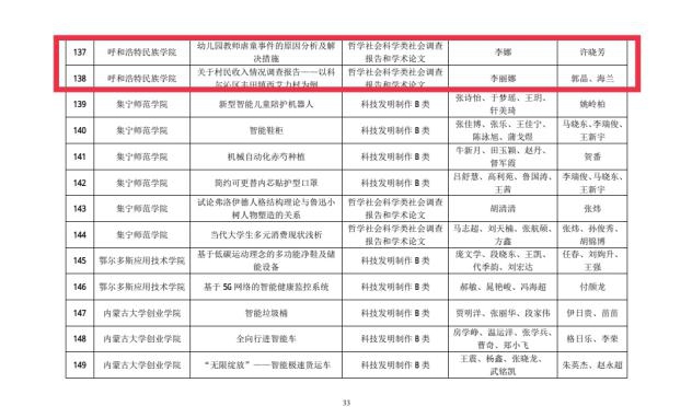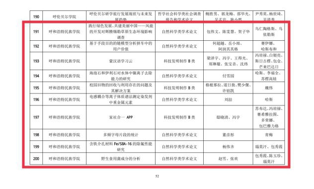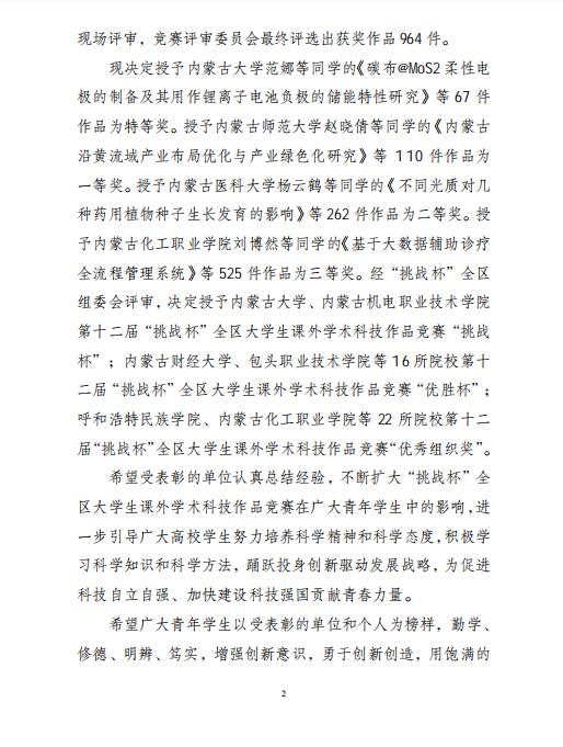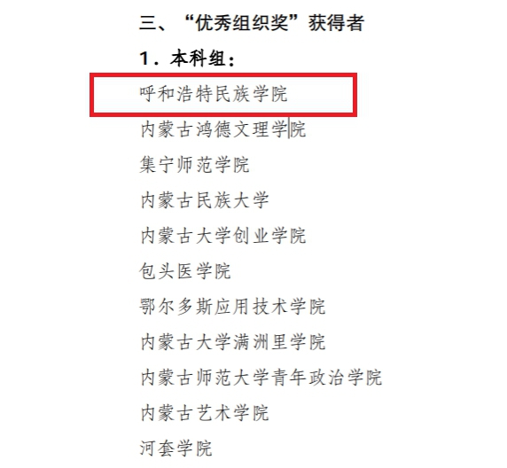 近日,共青團內蒙古自治區委員會、內蒙古自治區教育廳、內蒙古自治區科學技術協會和內蒙古自治區學生聯合會發布《關于第十二屆“挑戰杯”全區大學生課外學術科技作品競賽表彰的決定》。我校在本次競賽中榮獲“優秀組織獎”,李延茂、烏依勒斯被評為“優秀工作者”,參賽學生作品榮獲多個獎項。