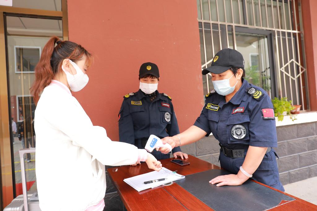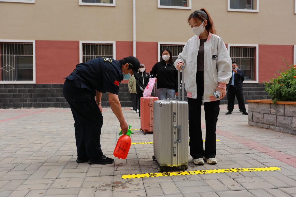 學生間隔一米,經行李消殺、足底消殺、手部消殺、登記及測量體溫合格后,方可進入宿舍。