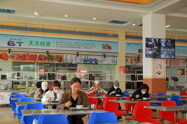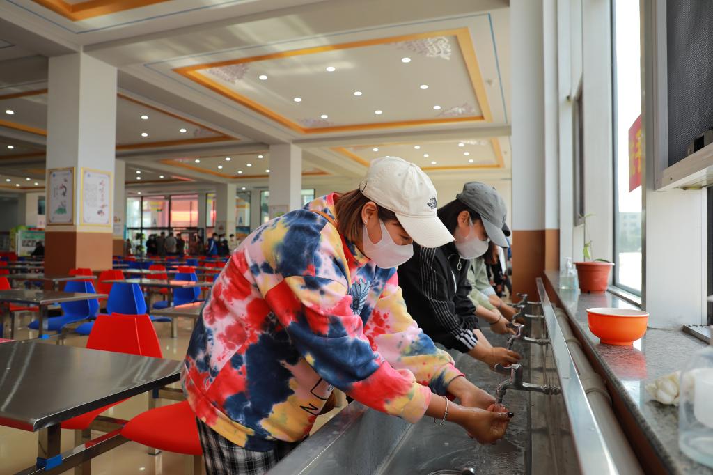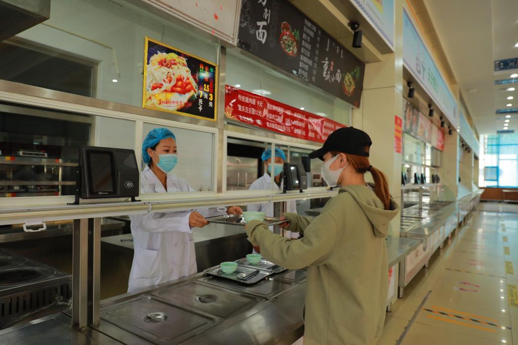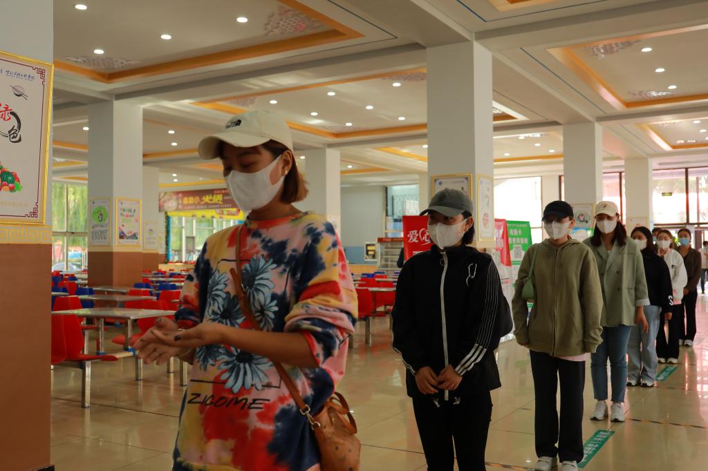 學生間隔一米,經測溫通道、手部消殺,依次排隊進入食堂。進入食堂后,需間隔一米,排隊打飯,錯位就坐用餐。