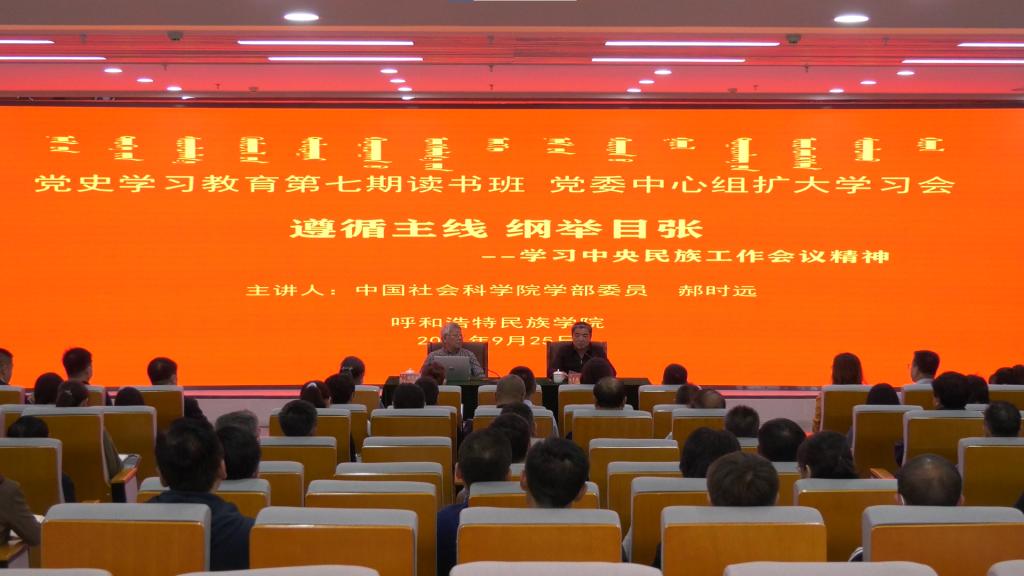 在全面開展黨史學習教育之際,為深入學習貫徹習近平總書記在中央民族工作會議上的重要講話精神,9月25日下午,我校以黨委理論中心組擴大學習形式舉辦黨史學習教育第七期讀書班,邀請我國著名的民族學家、中國社會科學院學部委員、中國人類學學會會長郝時遠教授作了《遵循主線 綱舉目張--學習中央民族工作會議精神》為題的專題輔導報告。全體校領導、黨委理論學習中心組成員、全體副處以上干部聆聽報告。學校黨委副書記、校長格日樂圖主持會議。