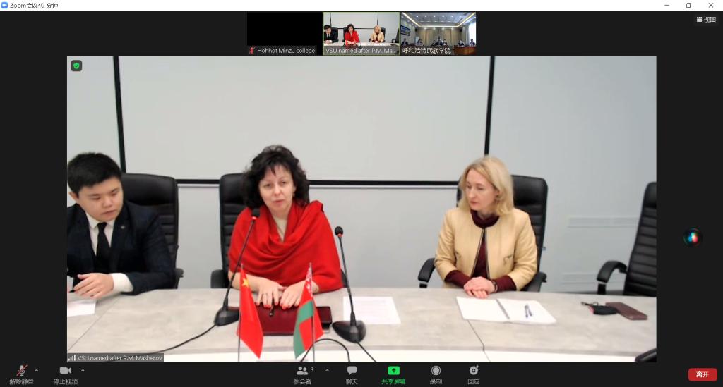 11月18日下午,格日樂圖校長在辦公樓四樓會議室,與白俄羅斯維捷布斯科馬舍洛夫國立大學校長瓦蓮京娜?瓦西里耶芙娜舉行兩校校際合作線上簽約儀式,并進行會談。