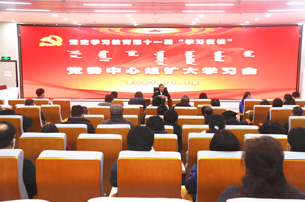 11月18日晚,在圖書館一樓報告廳召開學校黨委理論學習中心組擴大學習會暨舉辦黨史學習教育第十一期“學習夜校”。會議由校黨委副書記、校長格日樂圖主持。全體中心組成員、全校副處級以上干部、副高以上職稱教師參加了集中學習會。