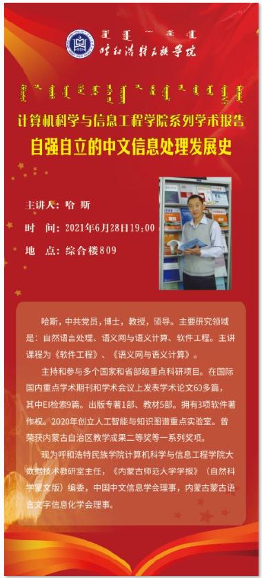 二、哈斯教授通過作題為“自強自立的中文信息處理發展史”的輔導講座,從為什么學習黨史引入主題,介紹王選為代表的中文信息處理專家團隊的艱難發展探索史來鼓勵同學們把自己的人生理想與祖國、時代、人類命運聯系起來,為實現中華民族偉大復興擔當作為。
