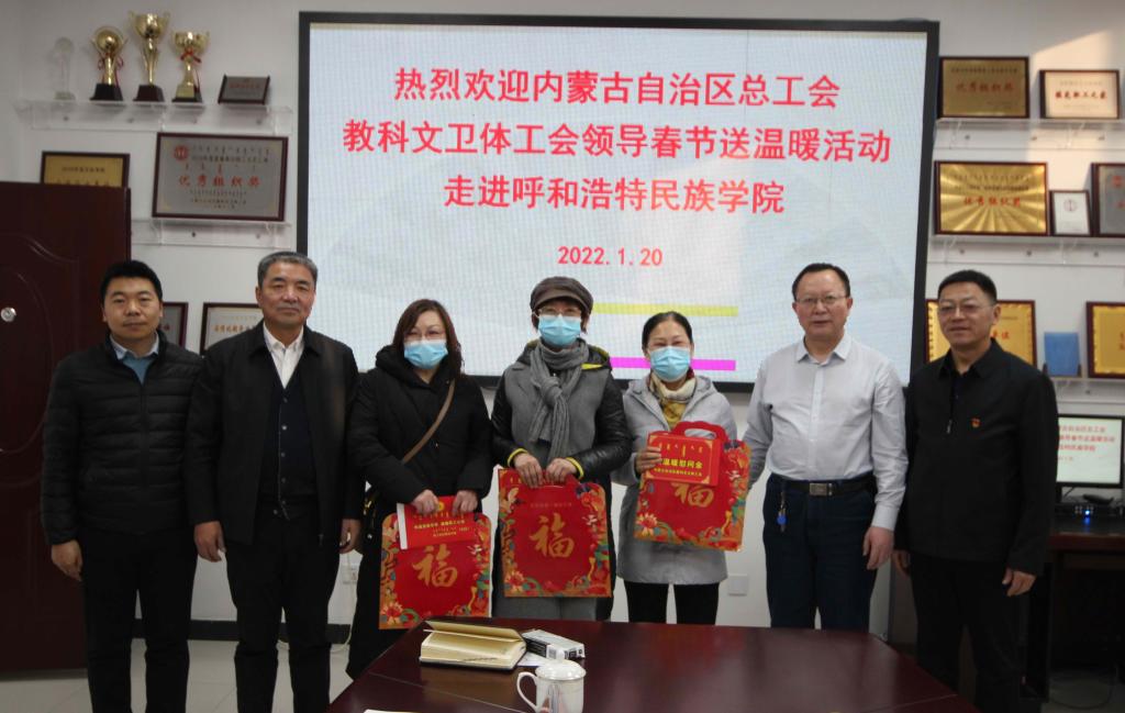 1月20日下午,在春節即將來臨之際,自治區總工會教科文衛體工會主席邢亦凡、工會干事楊超到我校開展“致敬勞動·情系職工”春節送溫暖活動,學校黨委副書記、校長格日樂圖,黨委委員、副校長高喜天,黨委委員、黨政辦主任朝格吉樂圖,統戰部副部長高娃、工會副主席烏力吉巴雅爾等陪同參加了活動。