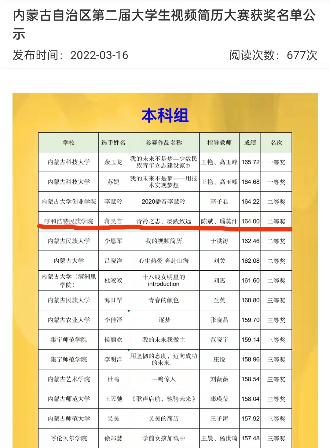 經(jīng)過激烈角逐,我校化學(xué)與環(huán)境學(xué)院蔣昊言獲得2022年“位來杯”內(nèi)蒙古自治區(qū)大學(xué)生視頻簡歷大賽總決賽(本科組)二等獎,化學(xué)與環(huán)境學(xué)院陳斌、瑙莫汗獲“優(yōu)秀指導(dǎo)教師”稱號。