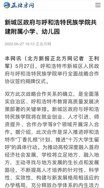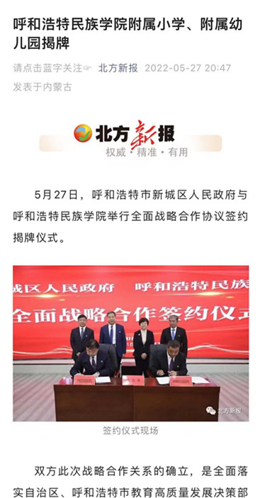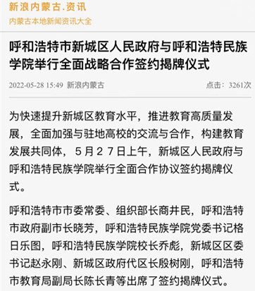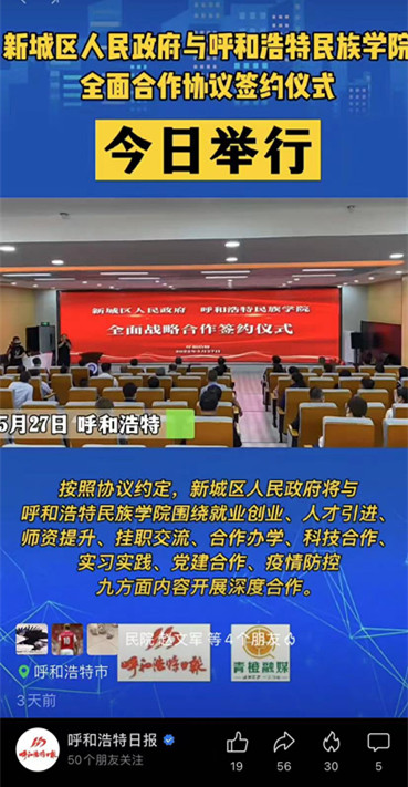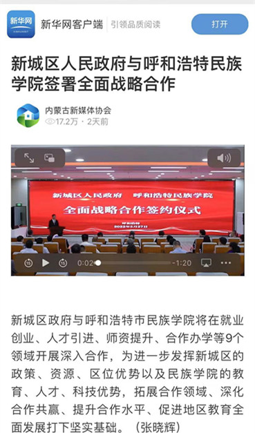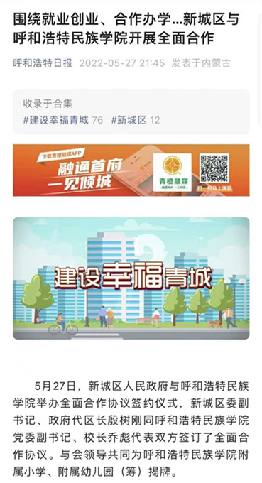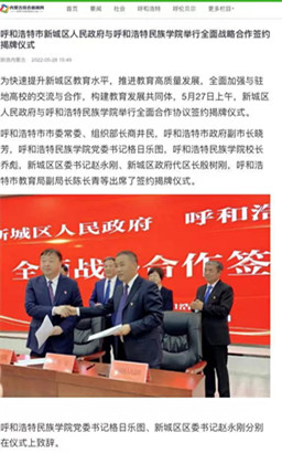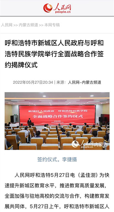 5月27日上午,新城區(qū)人民政府與我校簽署全面戰(zhàn)略合作框架協(xié)議。人民網(wǎng)、新華網(wǎng)、草原客戶端、內(nèi)蒙古新聞網(wǎng)、呼和浩特日?qǐng)?bào)等主流媒體進(jìn)行了跟蹤報(bào)道。新浪新聞、騰訊新聞、搜狐新聞等多家媒體進(jìn)行了轉(zhuǎn)載報(bào)道。媒體的廣泛關(guān)注,進(jìn)一步擴(kuò)大了我校的知名度、美譽(yù)度。