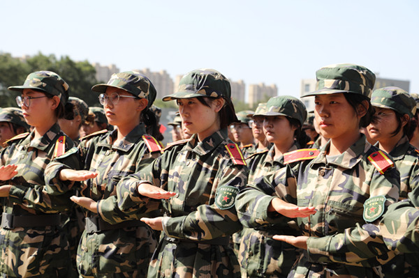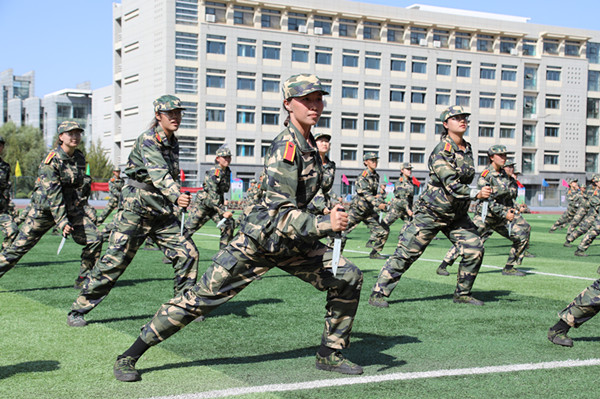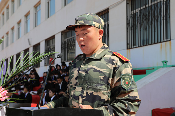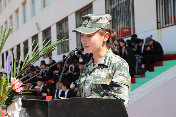 文學院趙磊同學代表教官和老生發言,她希望學弟、學妹們,在日后的學習生活中能保持軍訓中學到的優秀習慣,在大學四年最寶貴的青春時光里能綻放青春,揚帆起航。