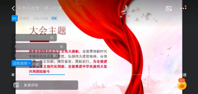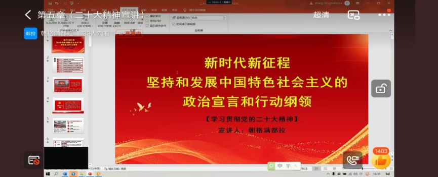 為進一步深入學習宣傳貫徹落實黨的二十大精神,馬克思主義學院組織全體思政課教師參加中宣部、教育部舉辦的全國高校思政課骨干教師研修班——二十大精神解讀、自治區教育廳組織的專家導學黨的二十大精神系列培訓班、東北師范大學馬克思主義學部舉辦的研究闡釋黨的二十大精神學術研討會暨集體備課會等活動,并于11月10-11月18日期間以專題形式開展宣講二十大精神的活動,取得良好成效。此次宣講活動以線上形式進行,覆蓋近4000余名學生,通過老師們的課堂專題宣講,幫助學生深刻理解黨的二十大召開的重大意義和二十大精神的核心要義,對于將黨的二十大精神全面有機融入學生實際生活起到了極大的促進作用,并有力推動習近平新時代中國特色社會主義思想和黨的二十大精神進教材、進課堂、進頭腦。