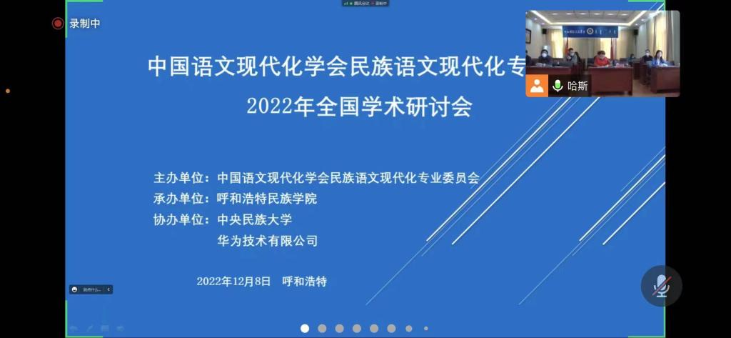 2022年12月8日,大雪節氣,由中國語文現代化學會、民族語文現代化專委會主辦、中央民族大學和華為技術有限公司協辦、呼和浩特民族學院承辦的“中國語文現代化學會 民族語文現代化專委會2022年全國學術研討會”在我校隆重召開。來自中國社會科學院、北京師范大學、中央民族大學、日本電氣通信大學、青海民族大學、內蒙古大學、內蒙古師范大學、企業的專家學者以及呼和浩特民族學院的部分師生共計200余人云上相聚,開展學術研討。